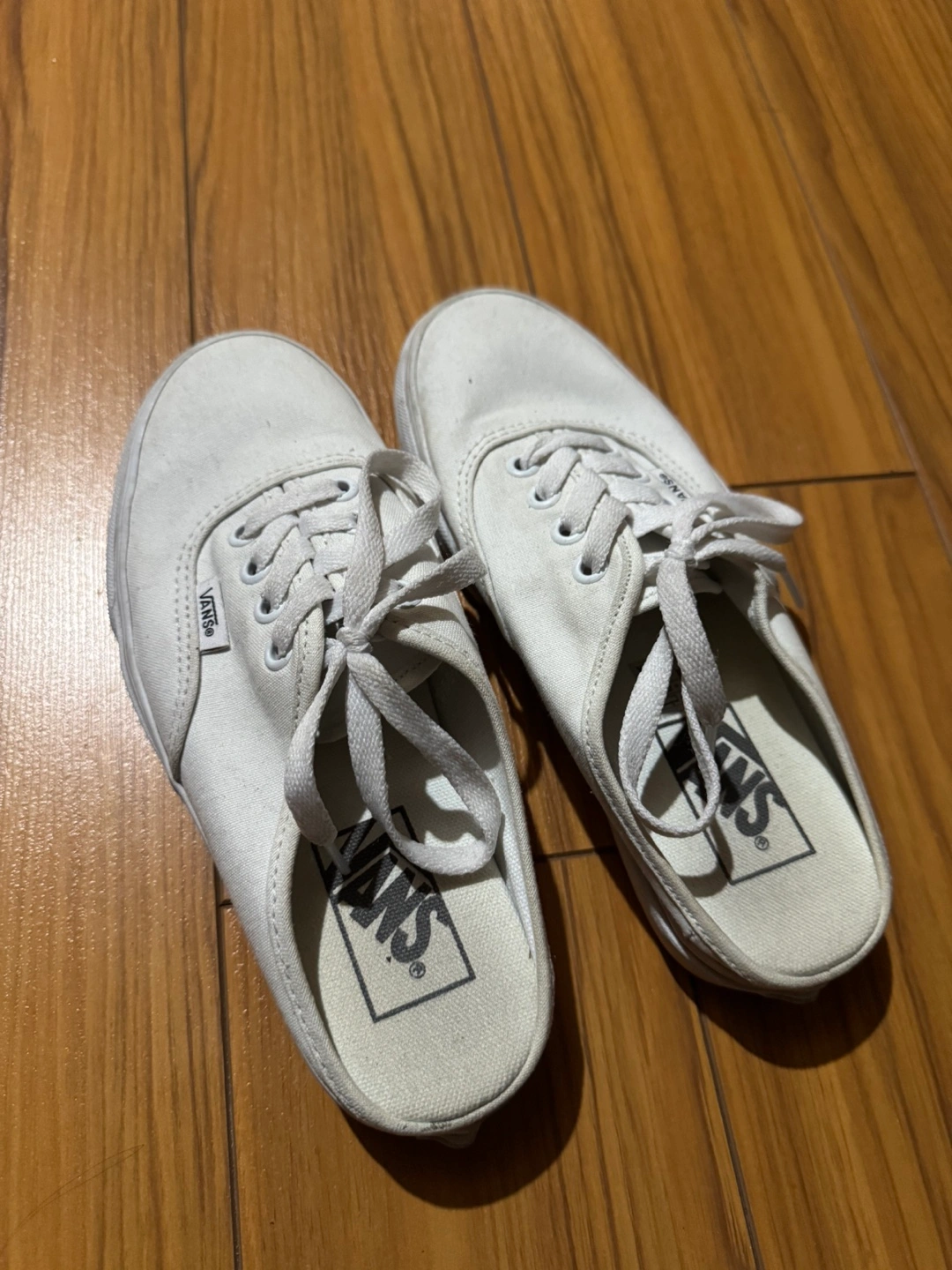 Pair of white canvas Vans slip-on shoes. Classic design, minimalist style. Good for everyday wear.