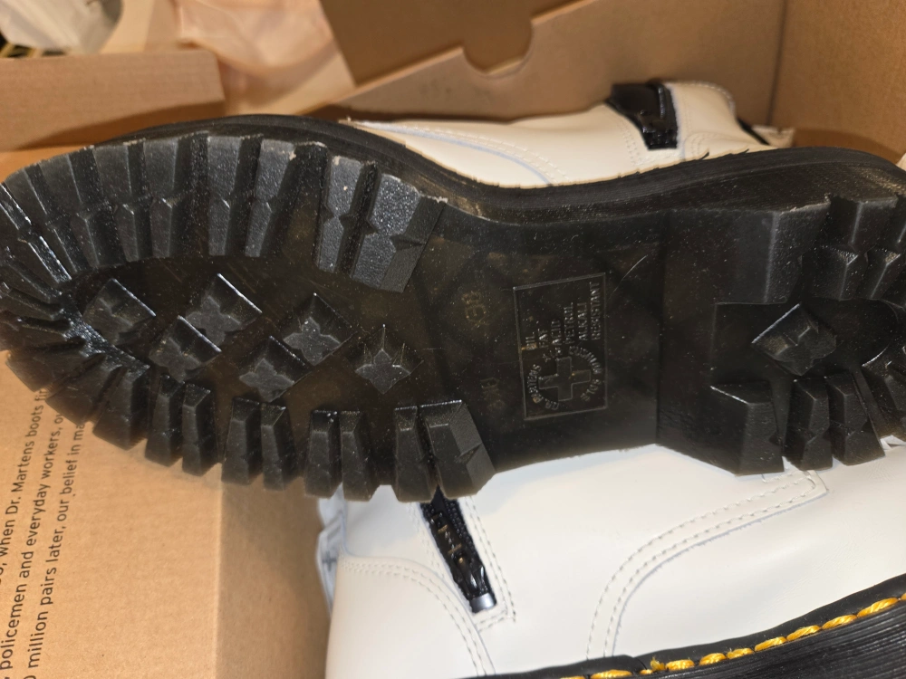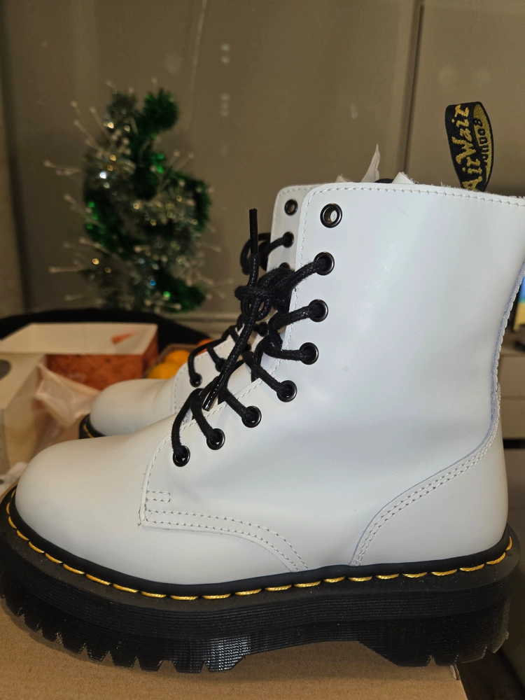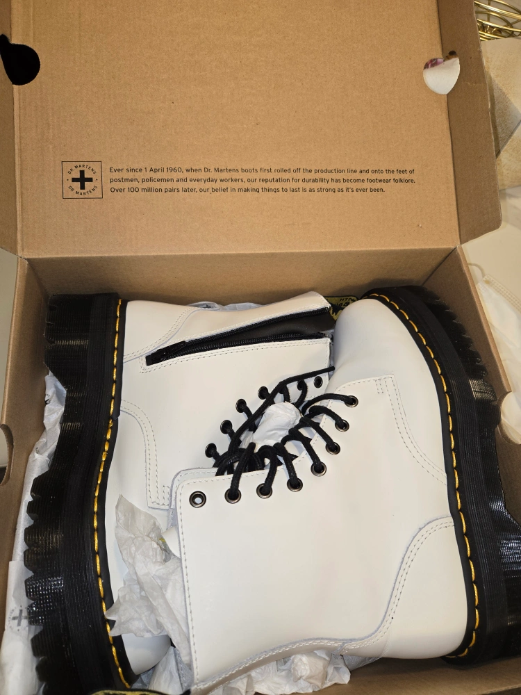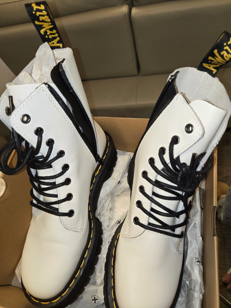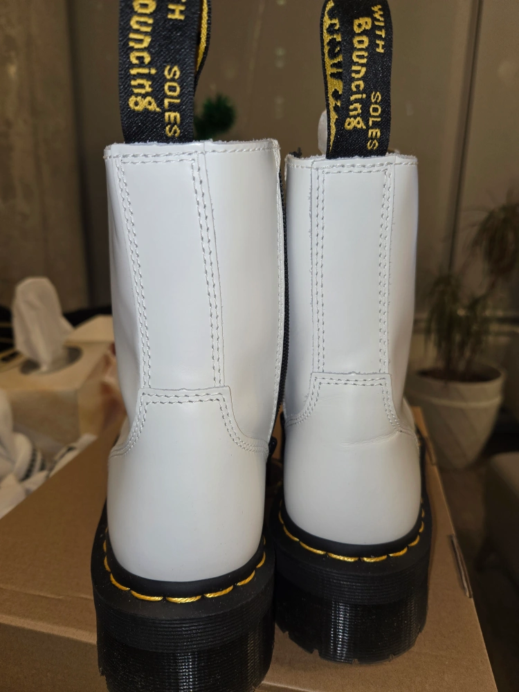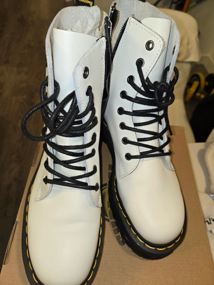 White leather Dr. Martens Jadon platform boots. Lace-up style with side zipper. Black laces and yellow stitching. comes with an original box. only wore once