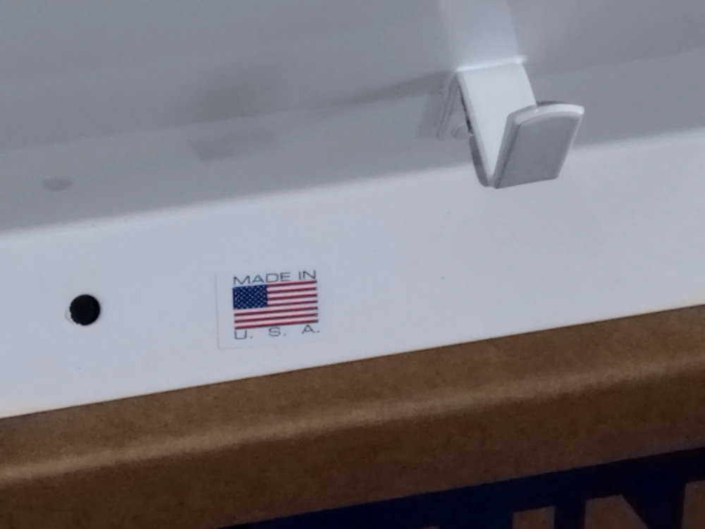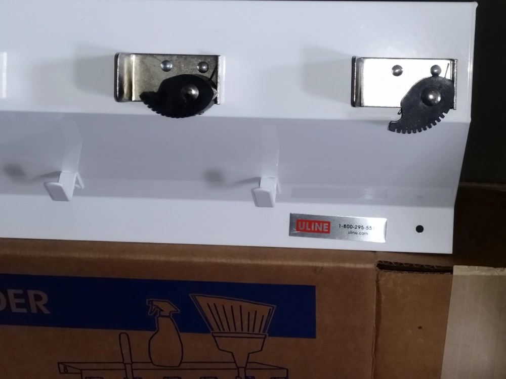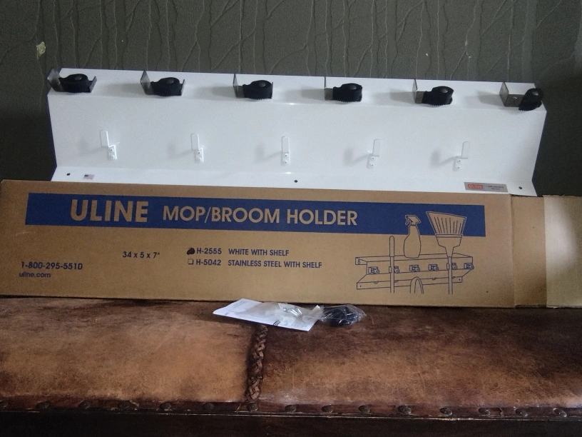 New Uline mop and broom holder. White colour. Includes shelf. Made in the U.S.A. Model H-2555.