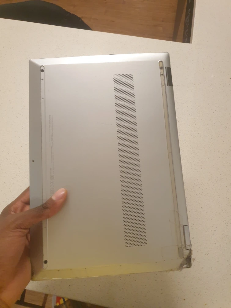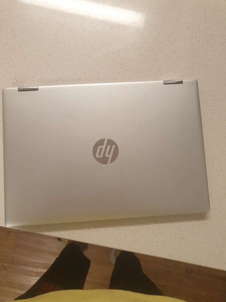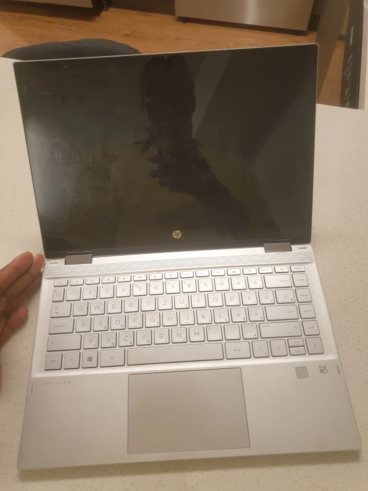 Silver HP Pavilion 2-in-1 laptop. Slight damage to the back. Keyboard and screen visible. Good for parts or repair.