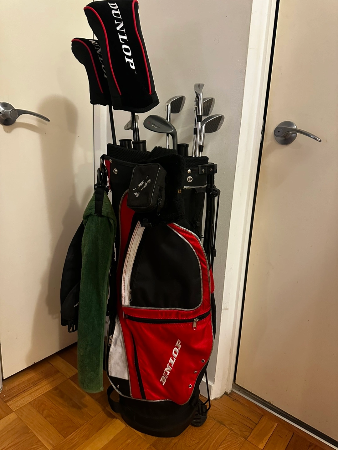 Pre-owned Dunlop golf club set. Includes irons, woods, and bag. Not a full set. Great for beginners or casual players. Clubs show some wear from use.