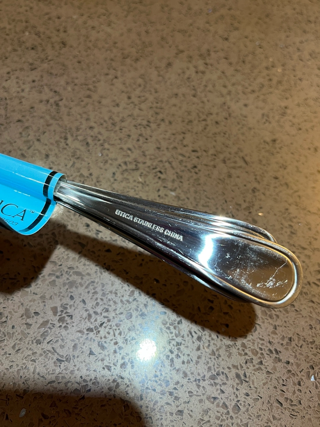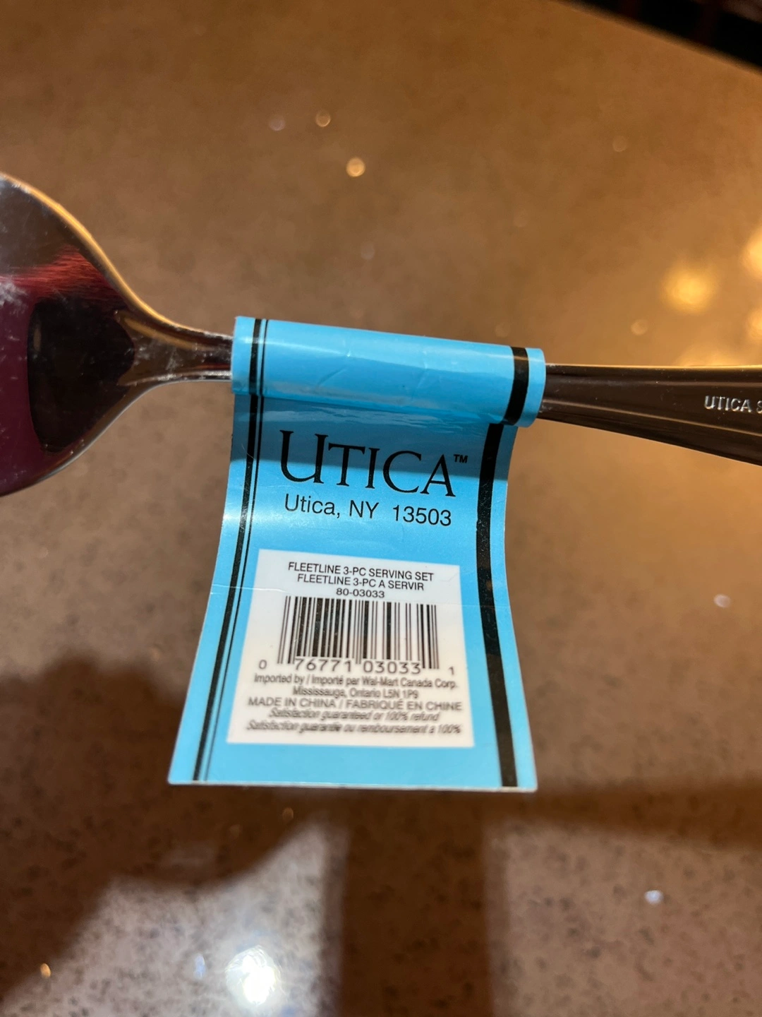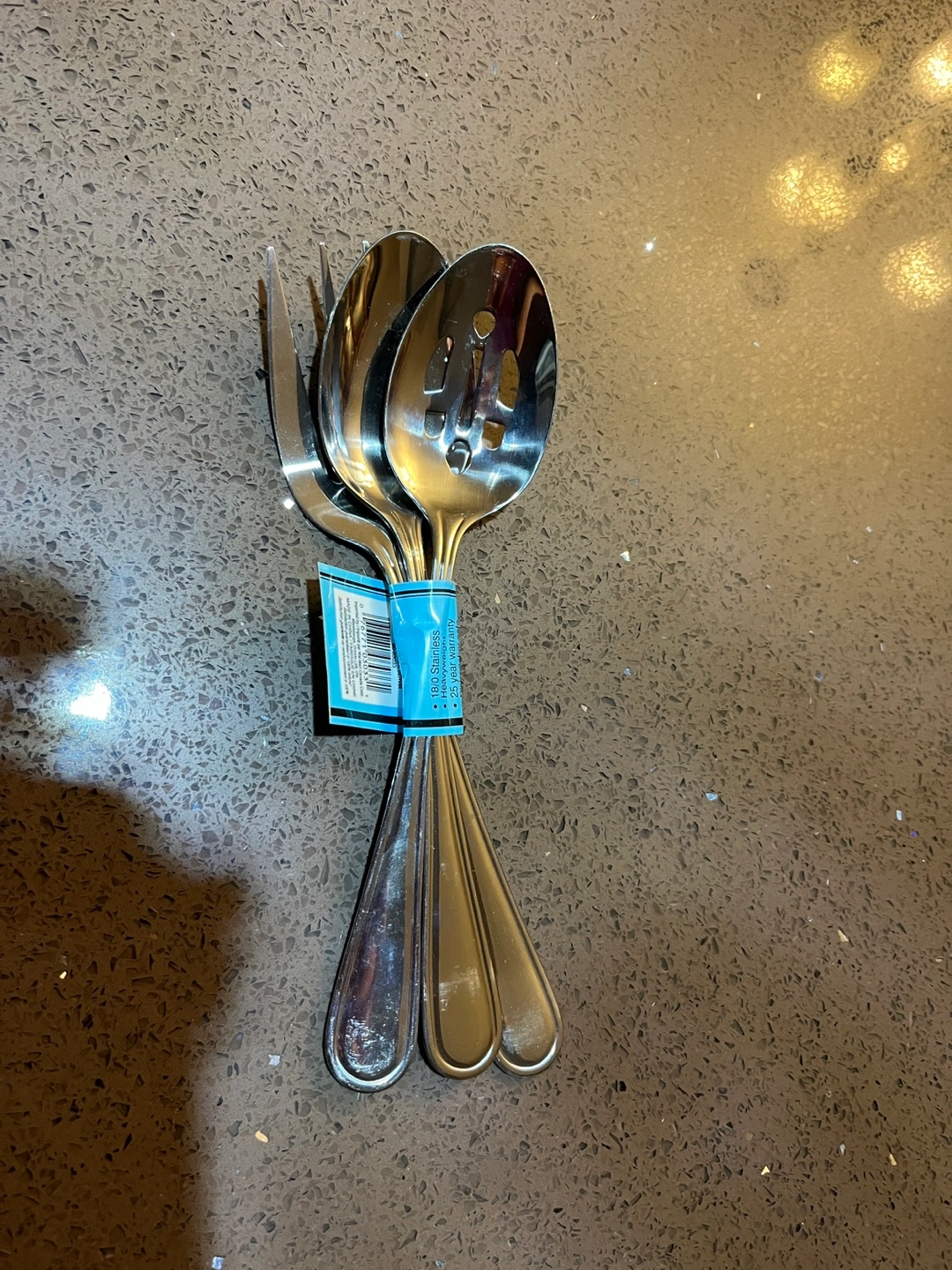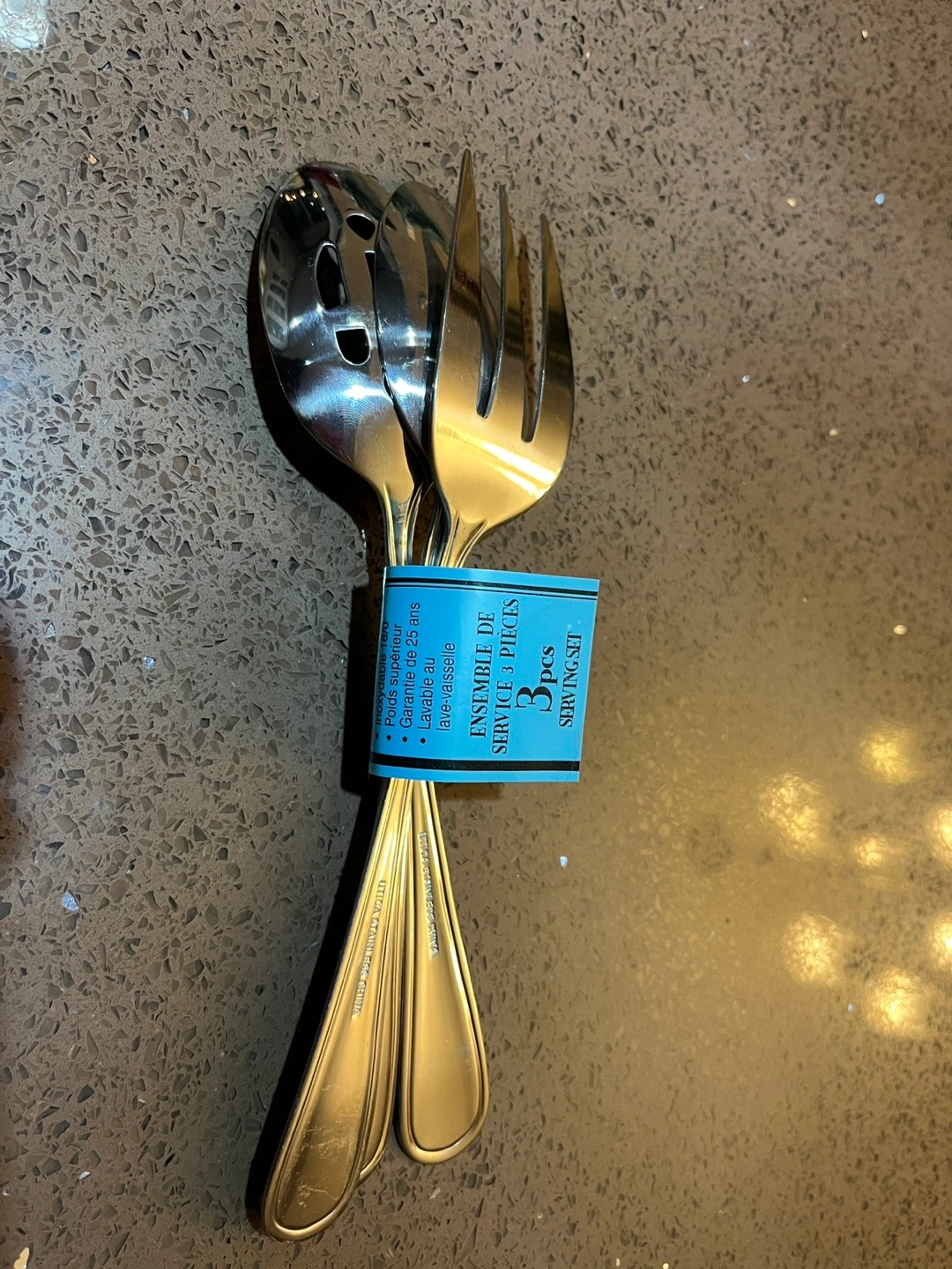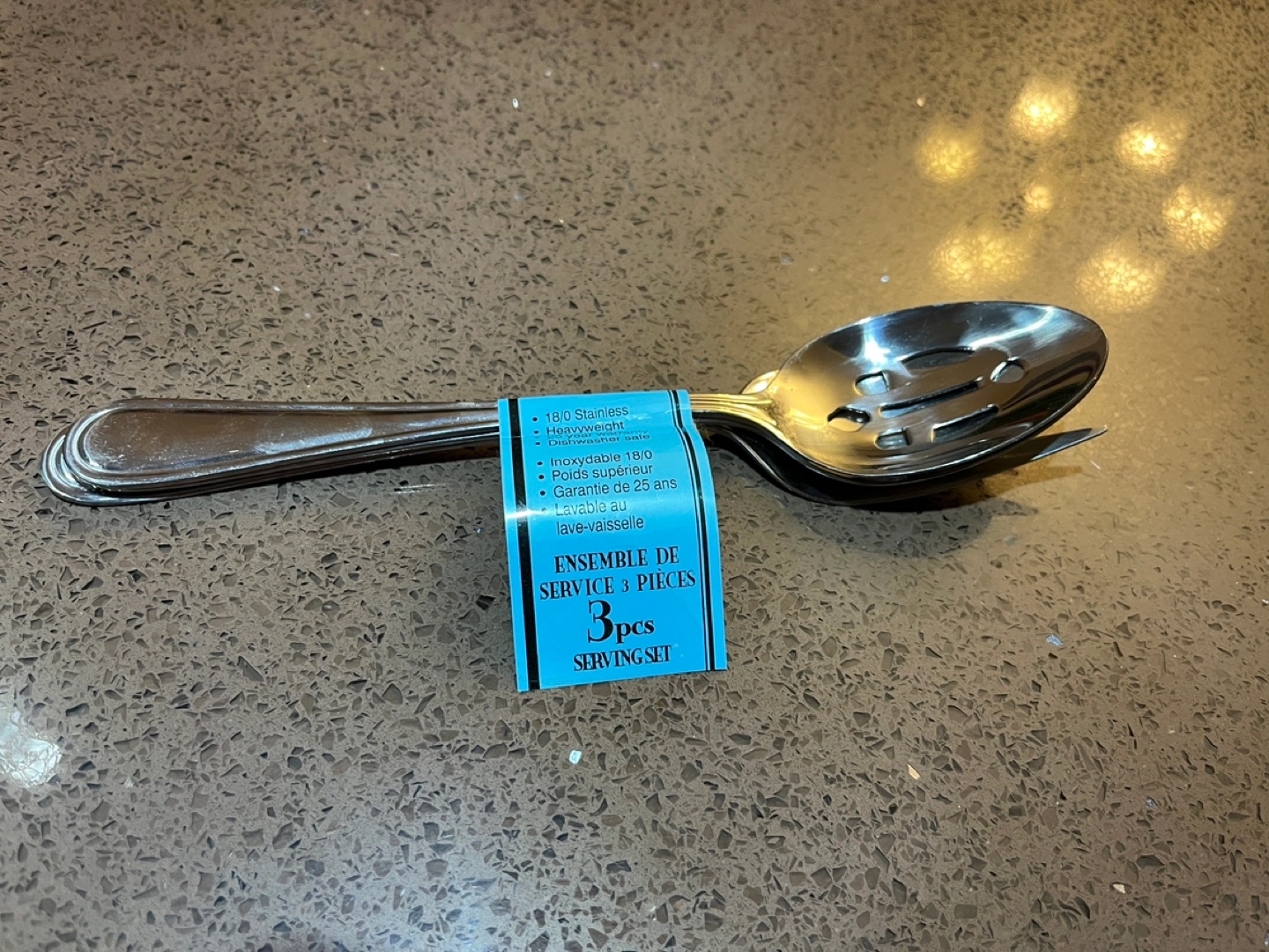 New with tags! Perfect addition to any dinner table. Includes a serving fork, serving spoon and slotted serving spoon. These gorgeous pieces are made from stainless steel and you can throw them in the dishwasher when the meal is over!