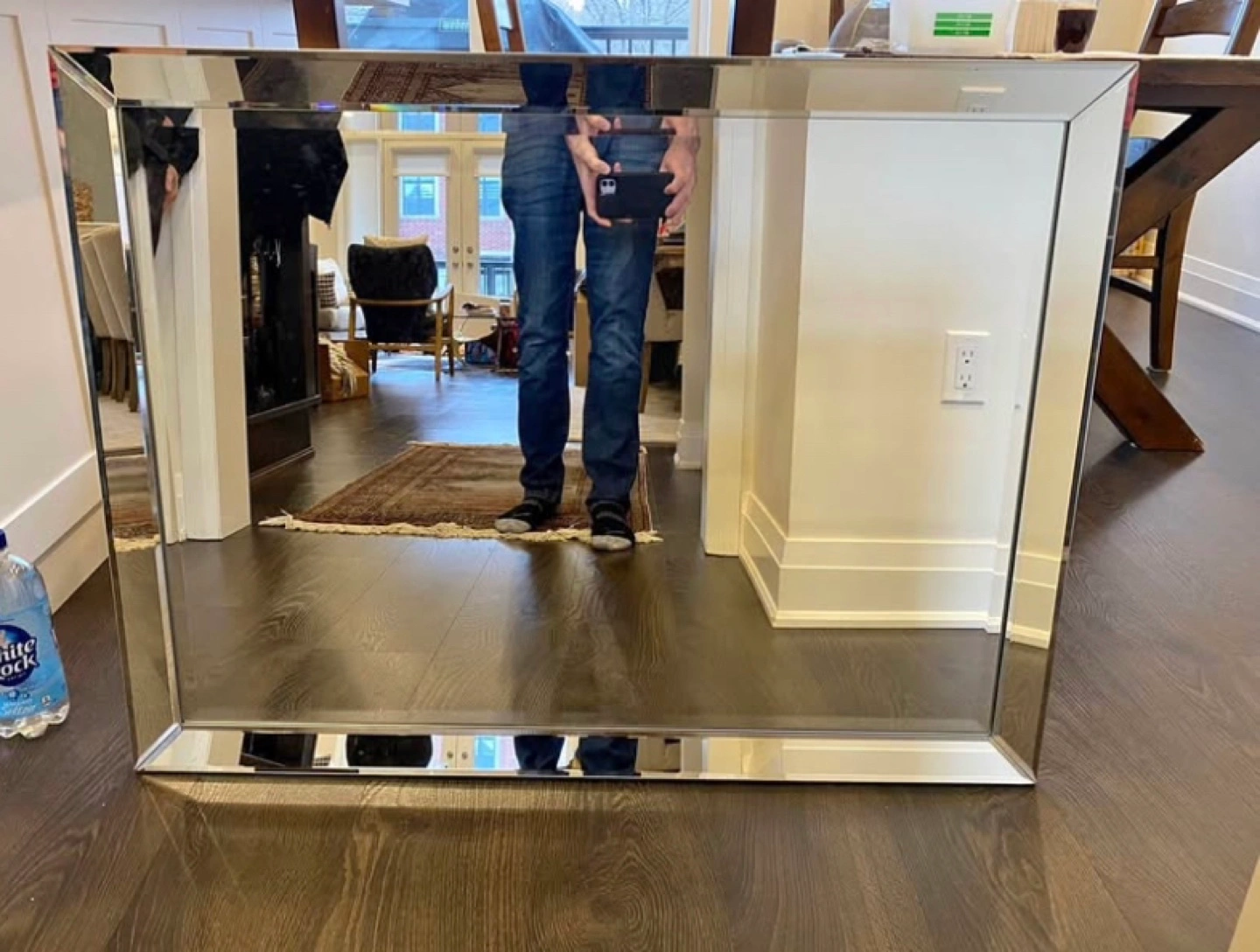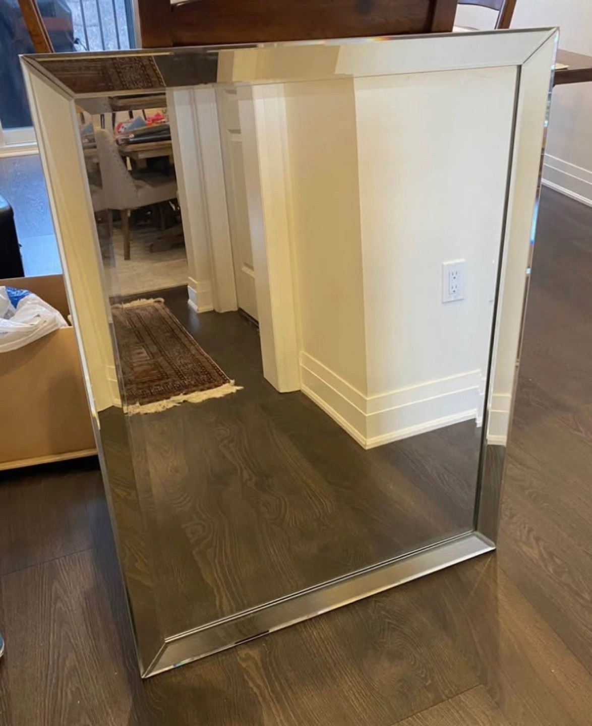 Large rectangular mirror. Silver beveled frame. Great for a hallway or entryway. Excellent condition.