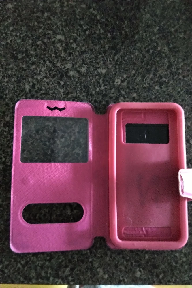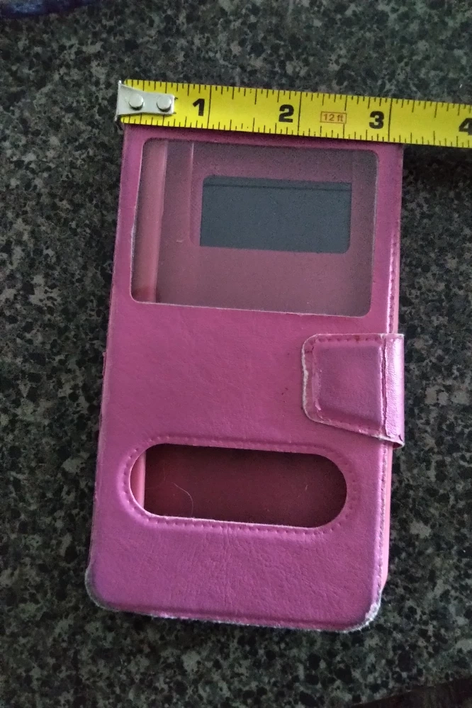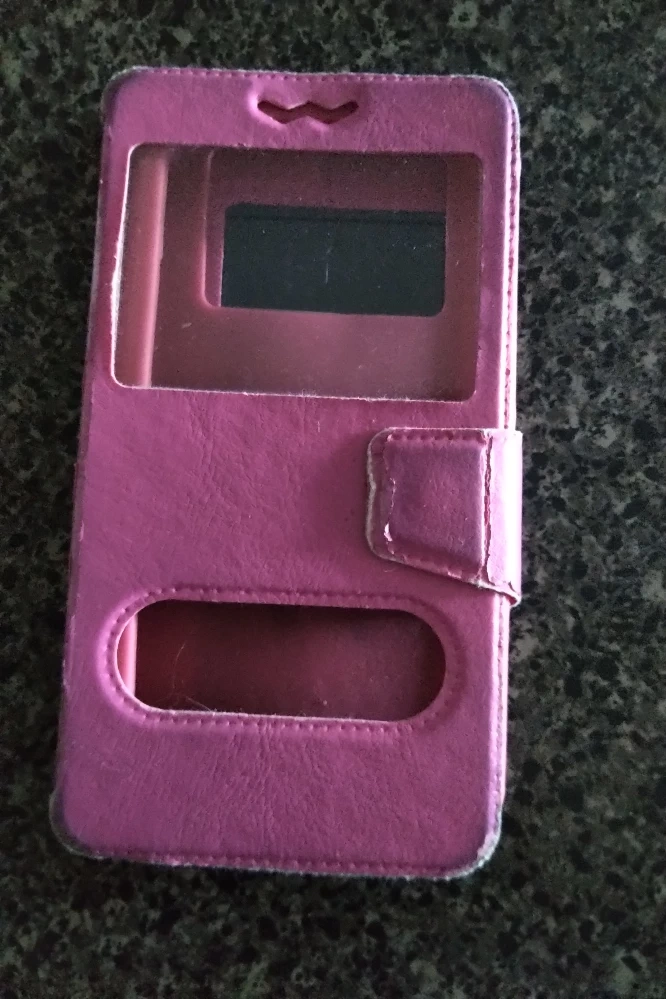 Pink phone case. Flip style. Clear viewing window. Approximately 6 inches tall. Shows some wear.