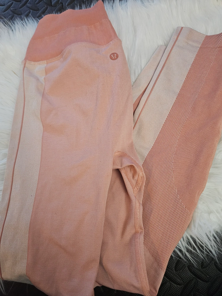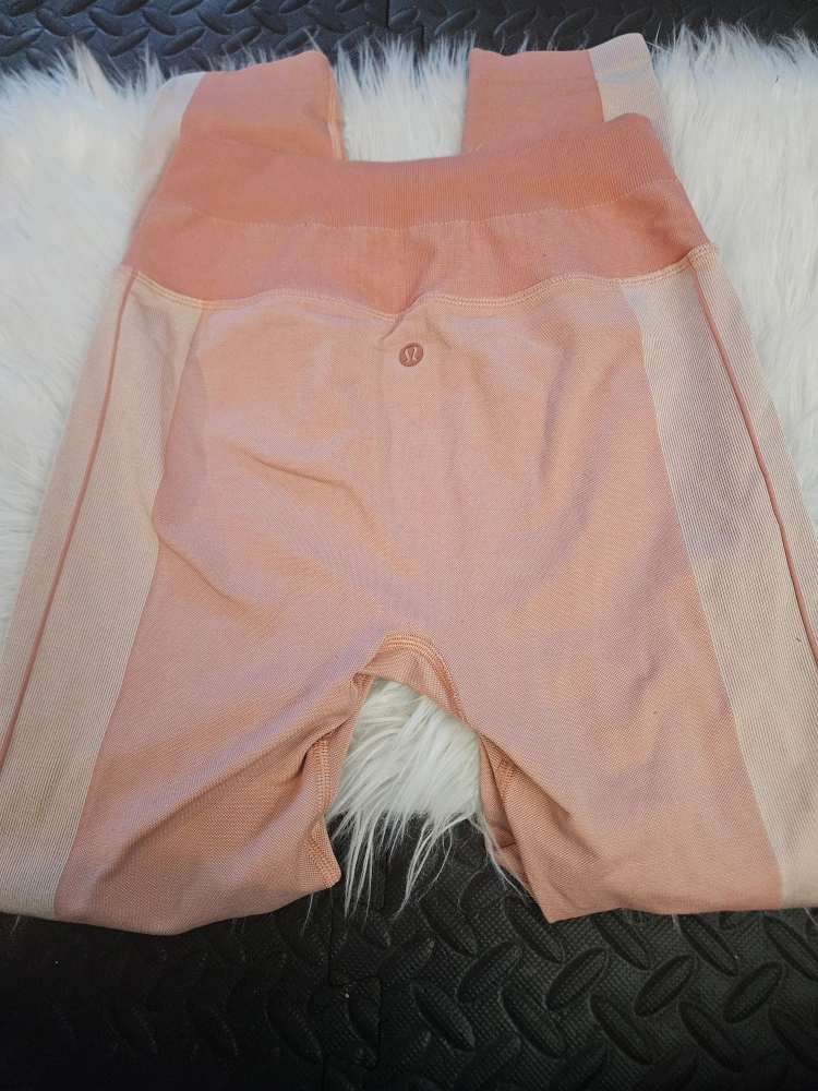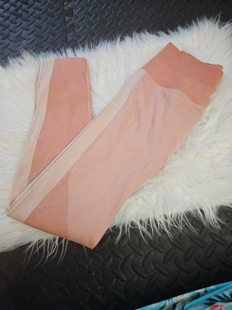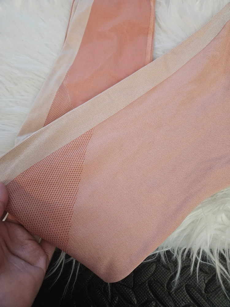 207High-waisted seamless leggings. Features a peachy-pink colour with off-white side stripes. Made from a stretchy, comfortable material. Perfect for workouts or casual wear.