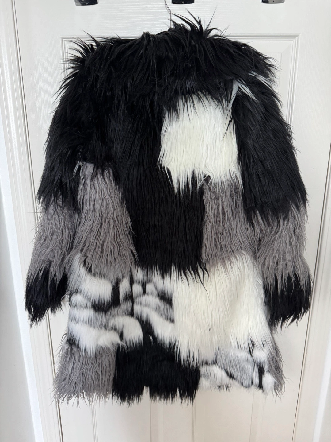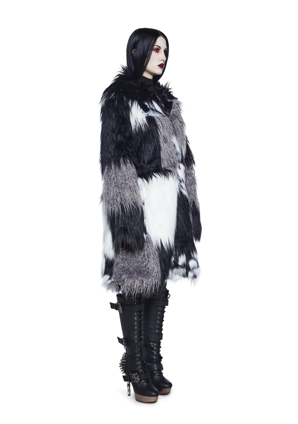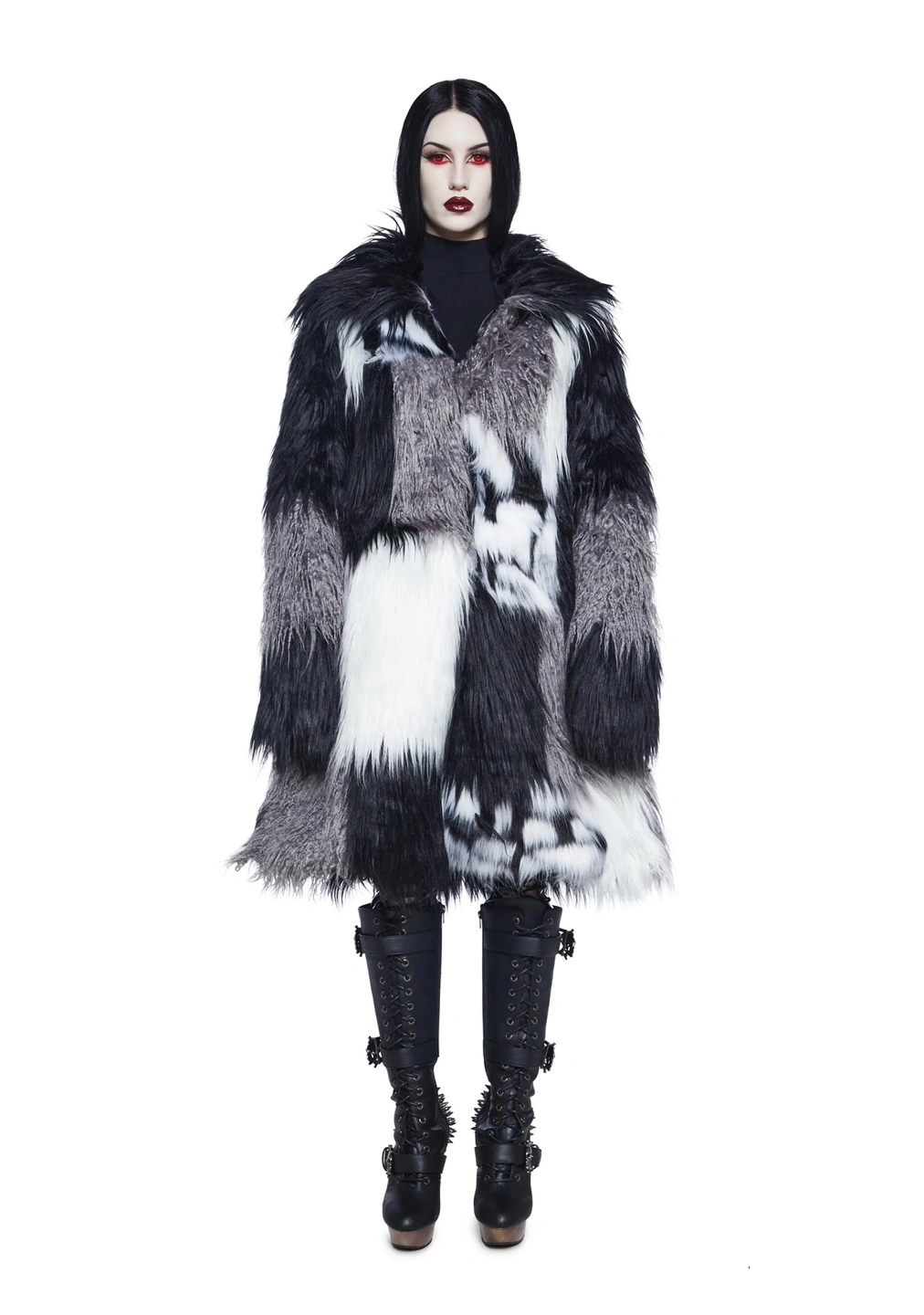 PALEBlend in with the mortals in this midi coat with a fuzzy faux fur construction, a patchwork design, a collared neckline, side pockets, front hook and eye closures.