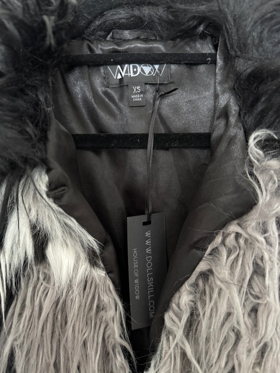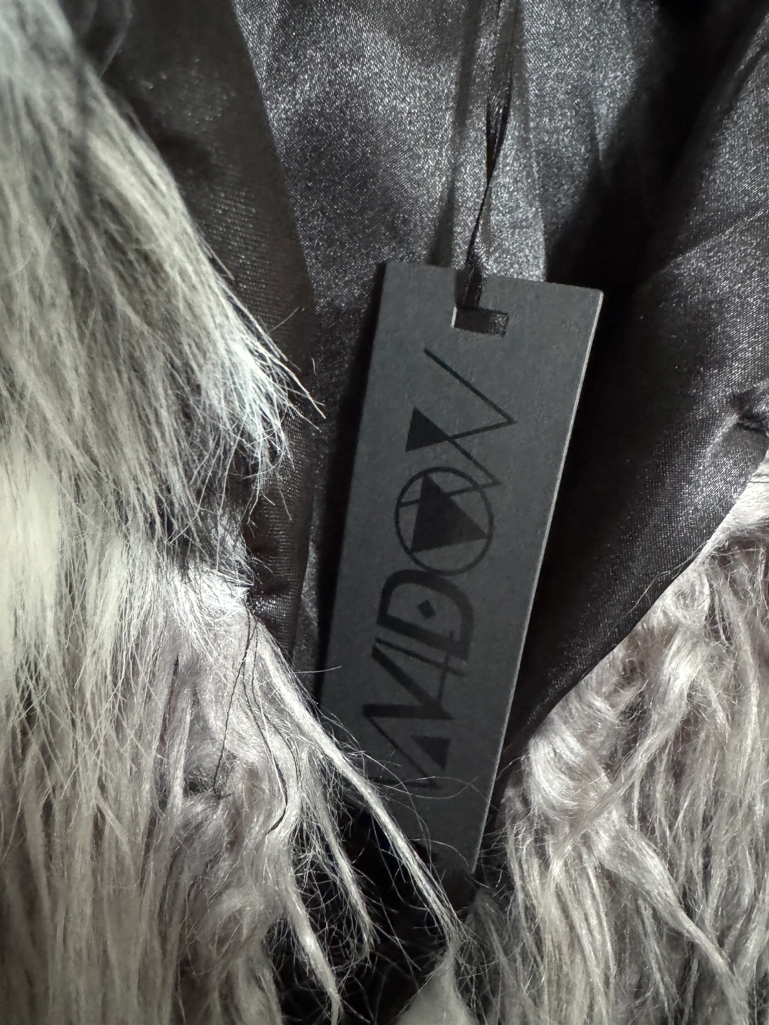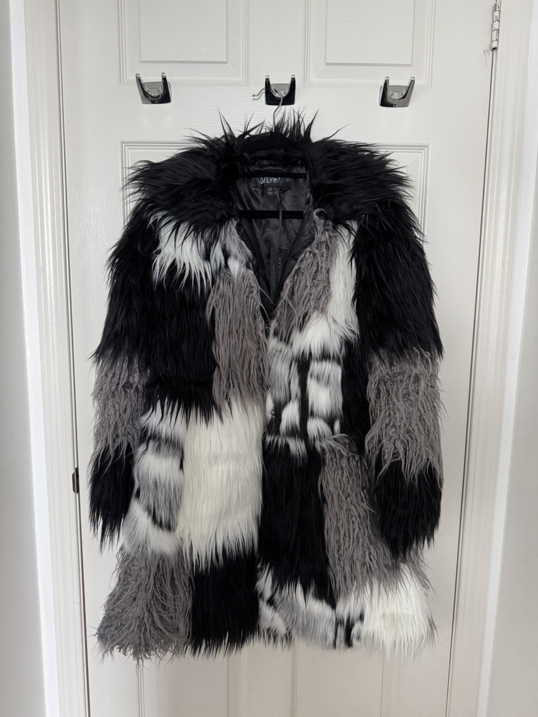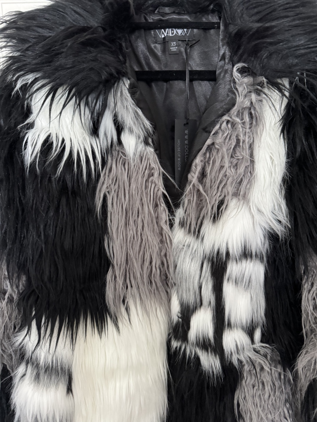 PALEBlend in with the mortals in this midi coat with a fuzzy faux fur construction, a patchwork design, a collared neckline, side pockets, front hook and eye closures.