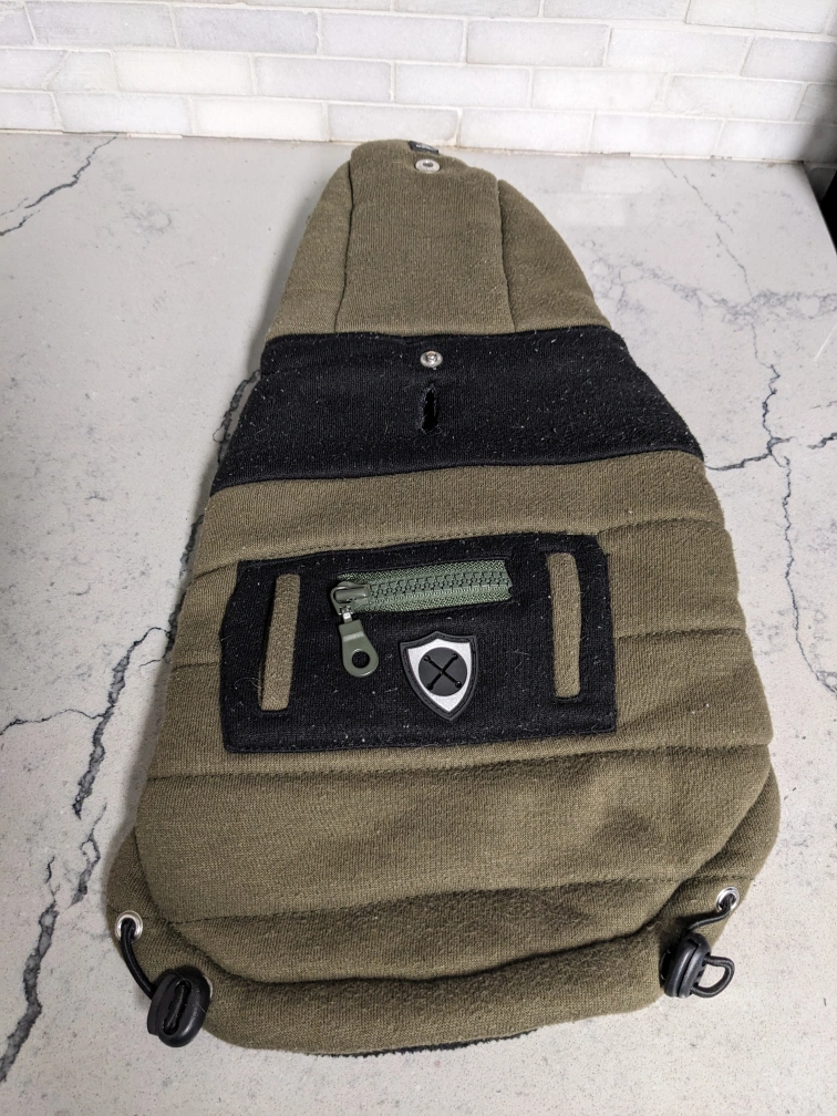 Forest green and black dog jacket. Features a hood and zipper closure. Fleece interior.