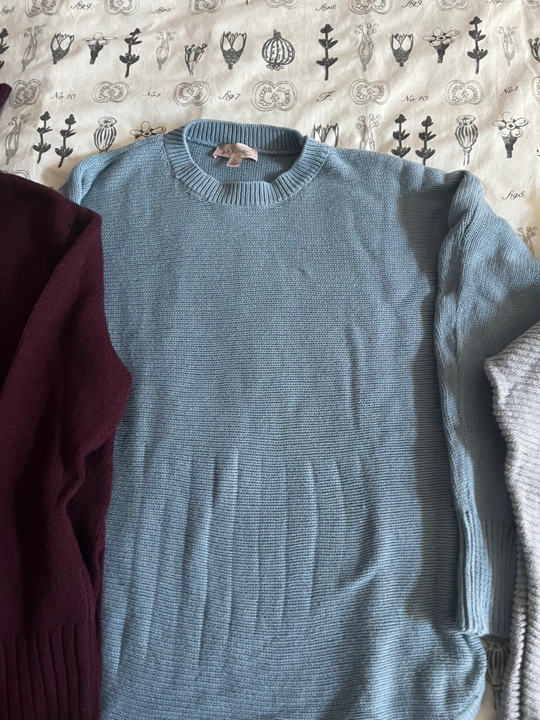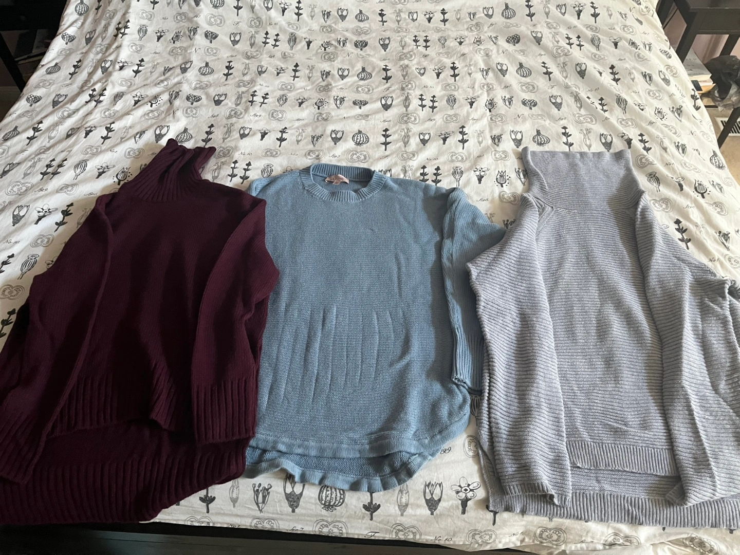 Bundle of three sweaters. Burgundy turtleneck, light blue crew neck, and grey turtleneck. Long sleeves, relaxed fit. Good for layering.