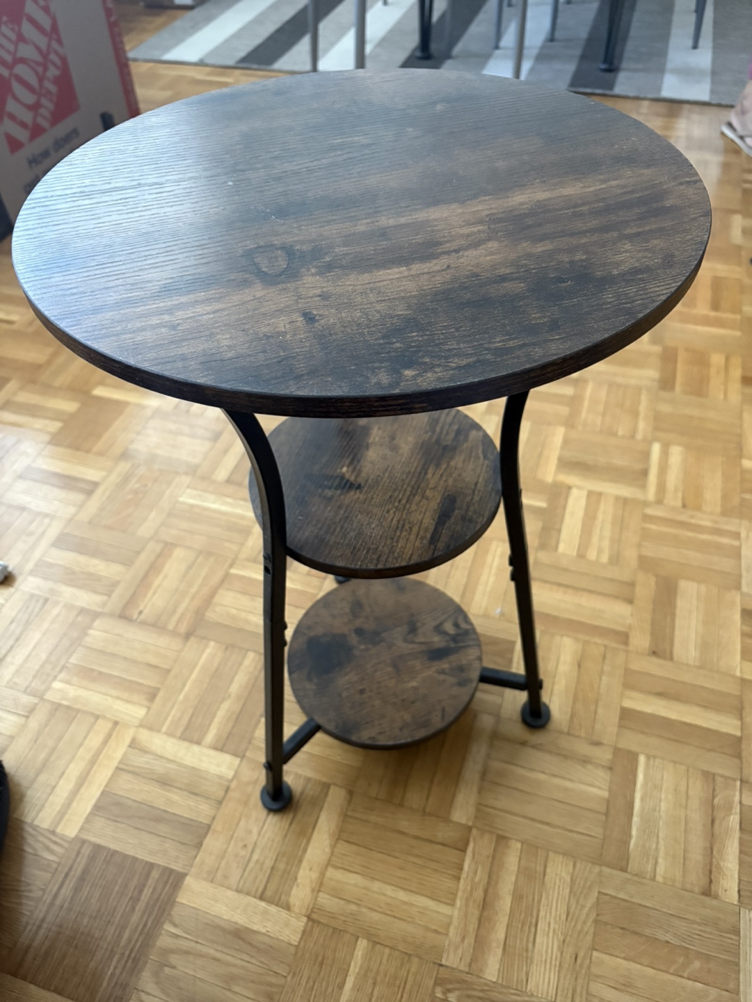 Small rustic round side table. Dark brown wood top and shelves. Black metal frame. Three tiers of shelving.