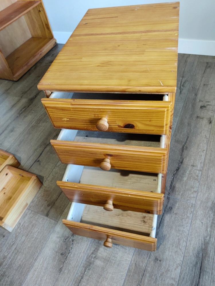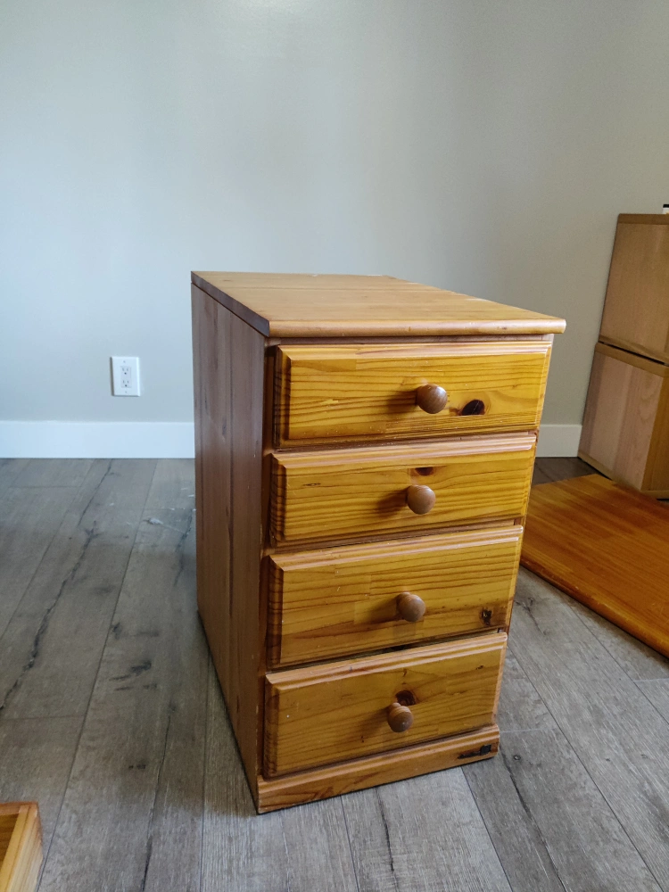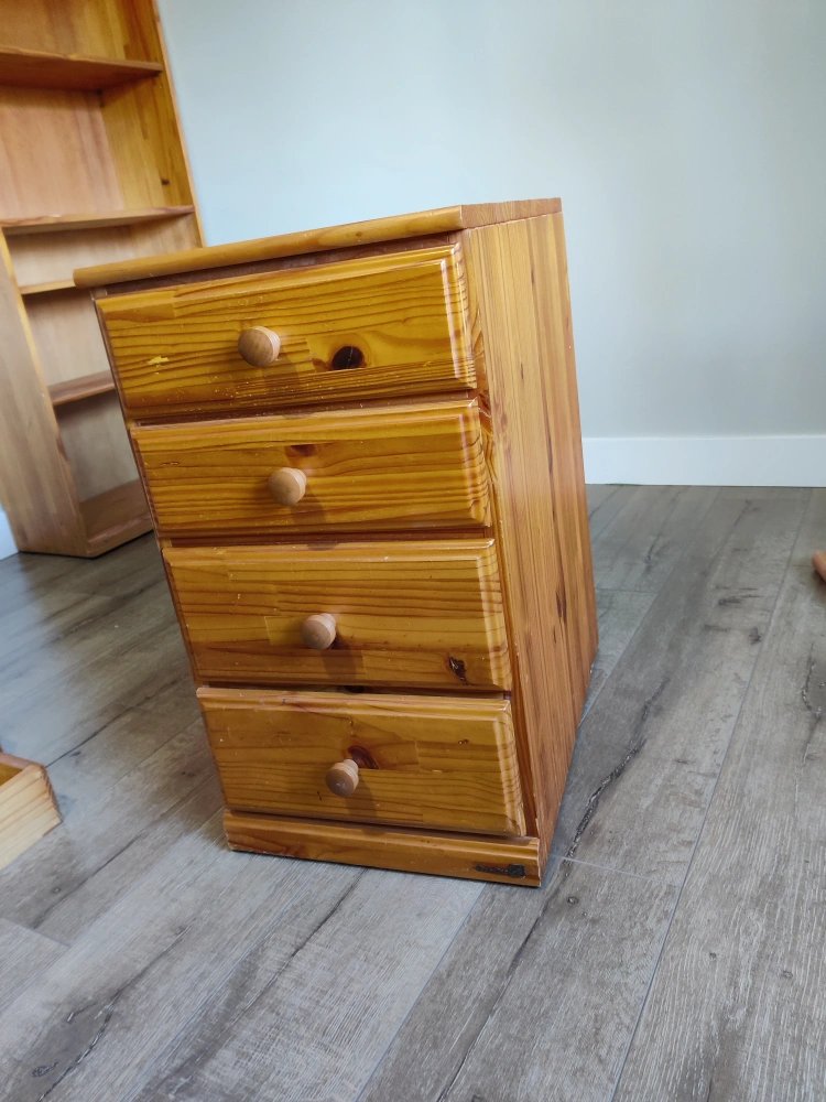 Four-drawer wooden chest. Solid pine construction. Small size, ideal for a bedroom or office. Drawers have wooden knobs.