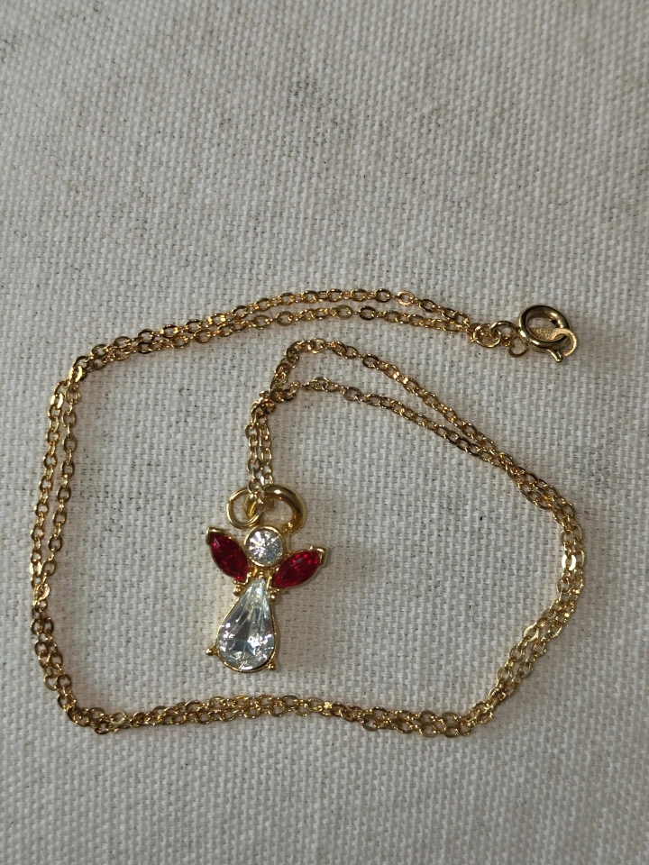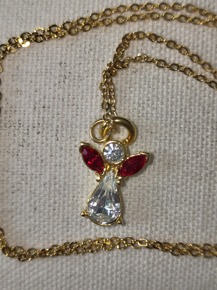 Beautiful gold tone chain necklace. Features a small angel pendant. Clear and red crystals embellish the pendant. Elegant and delicate.