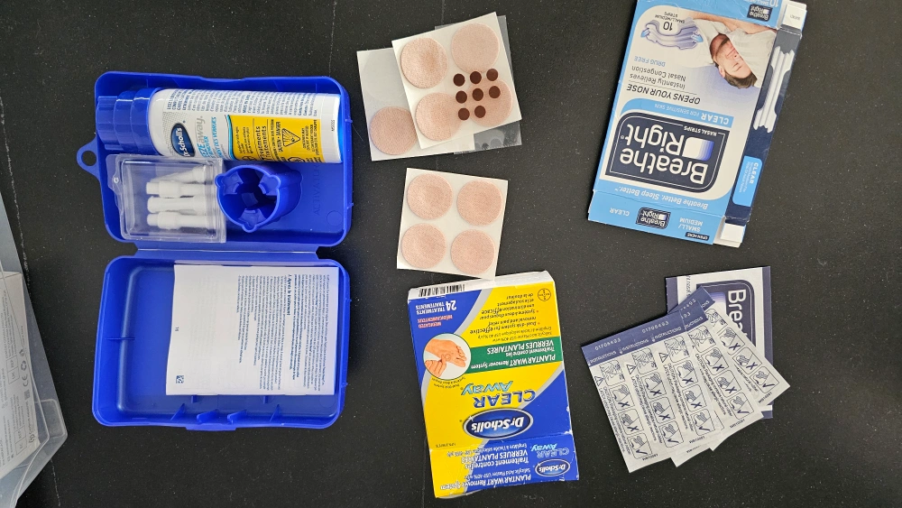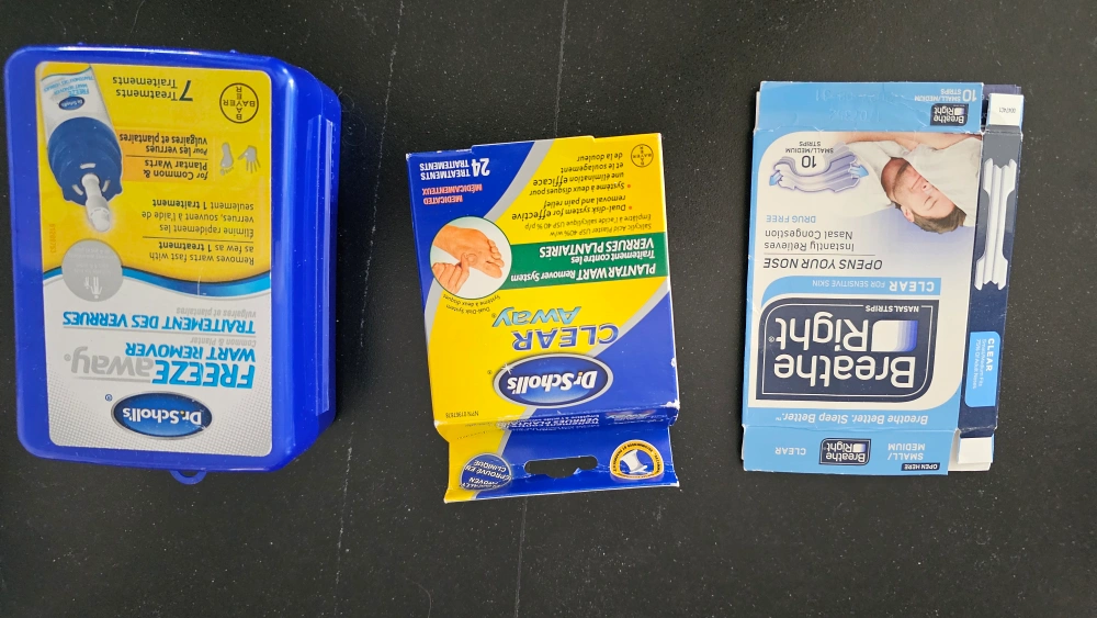 Collection of first-aid supplies. Includes Dr. Scholl's Freeze Away wart remover, Clear Away plantar wart remover, and Breathe Right nasal strips. Various sizes and quantities.