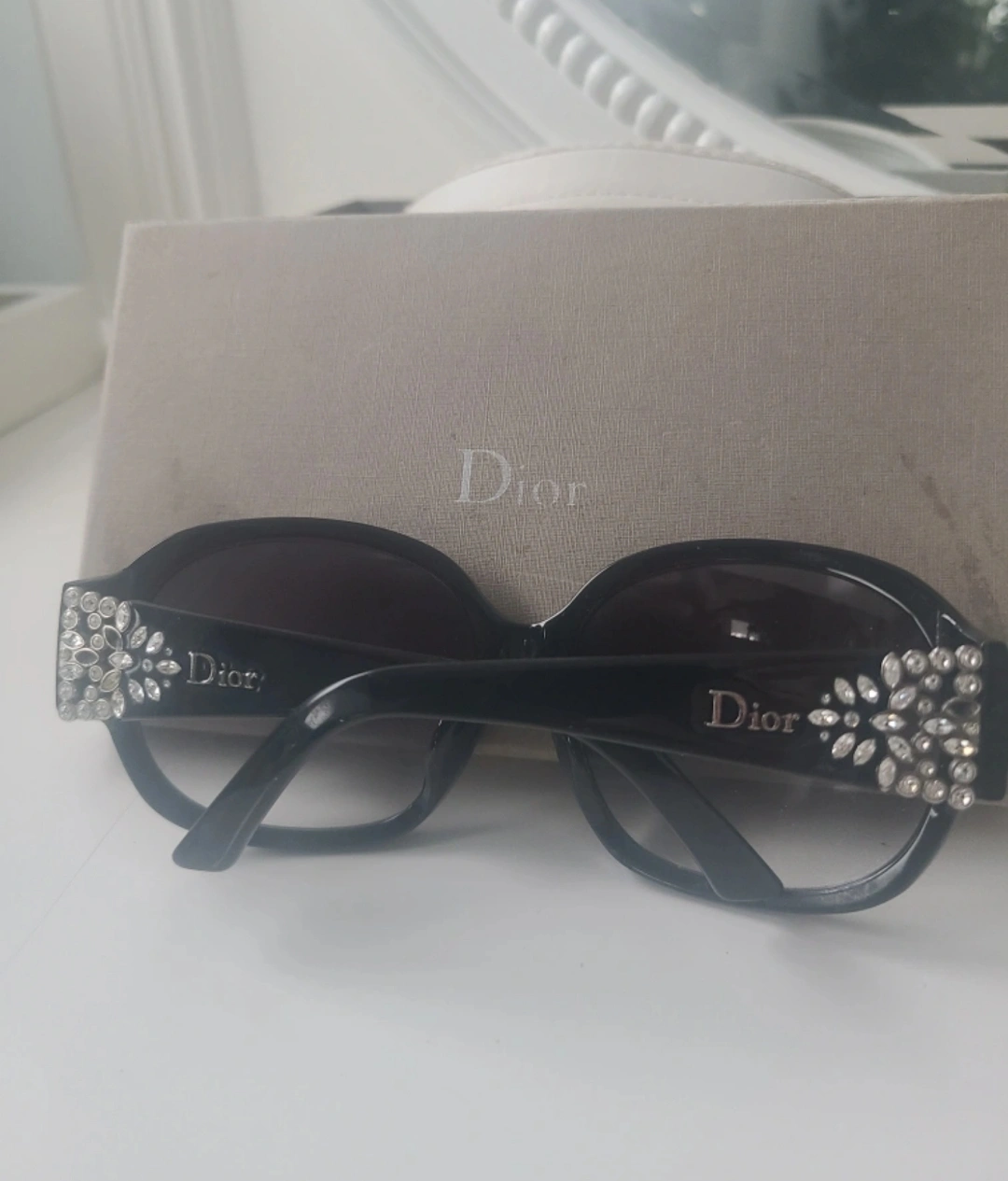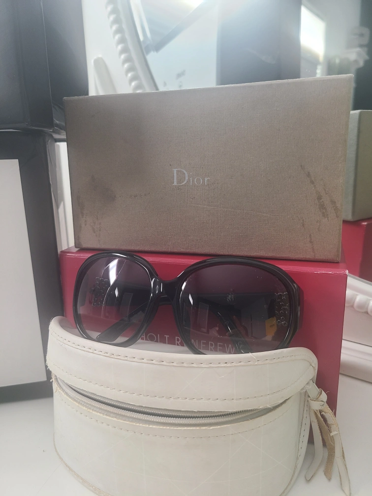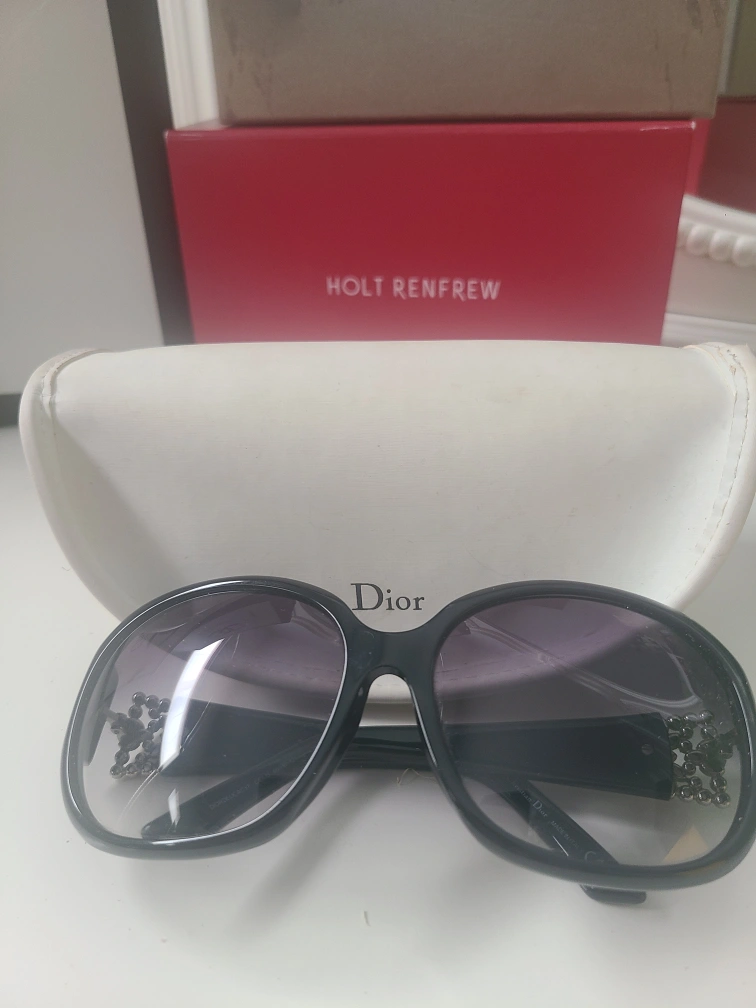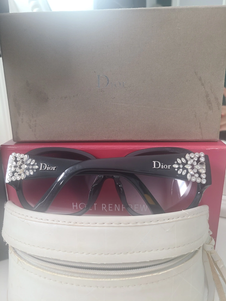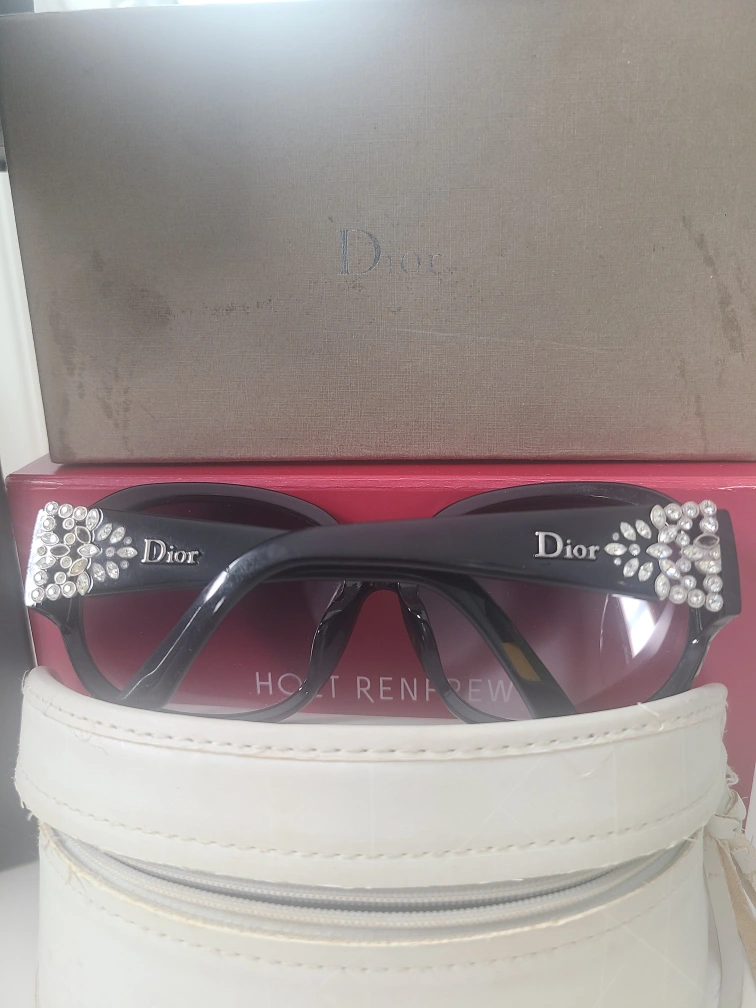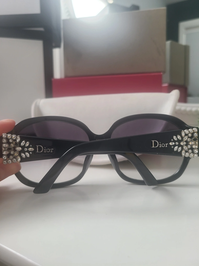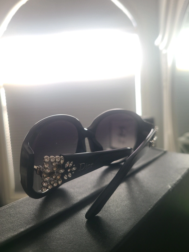 Authentic Pre-owned Christian Dior sunglasses. Black frame. Swarovski crystal embellishments with a few missing.