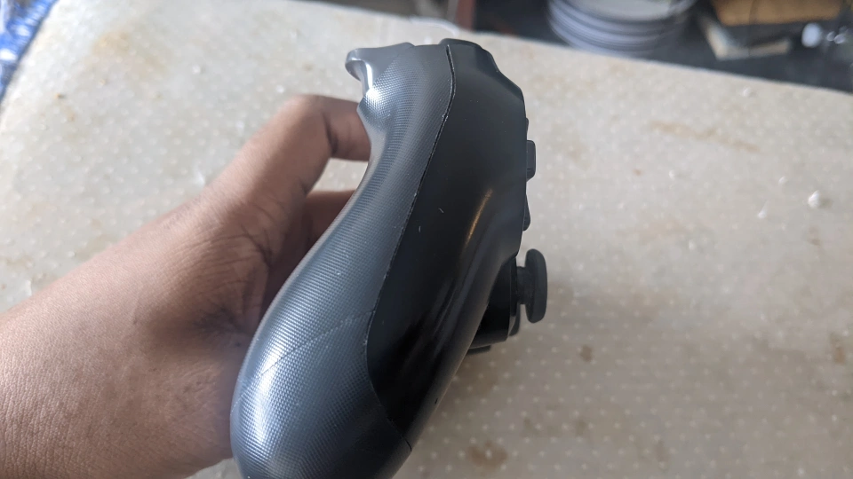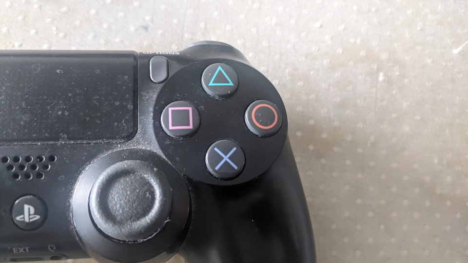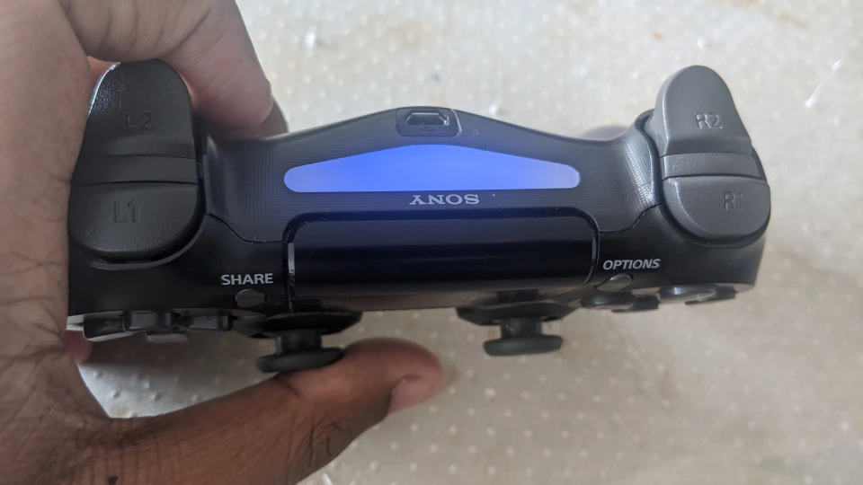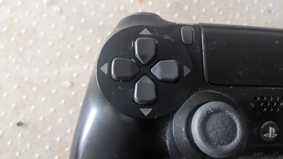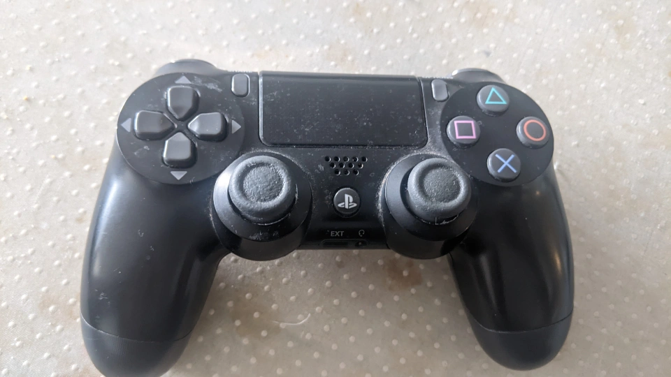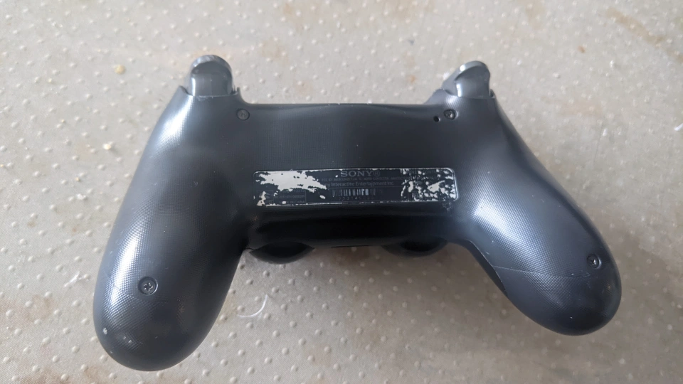 Pre-owned black PlayStation 4 controller. Shows some wear and tear. Buttons and thumbsticks are functional. Minor scratches and scuffs present. Great for gaming.