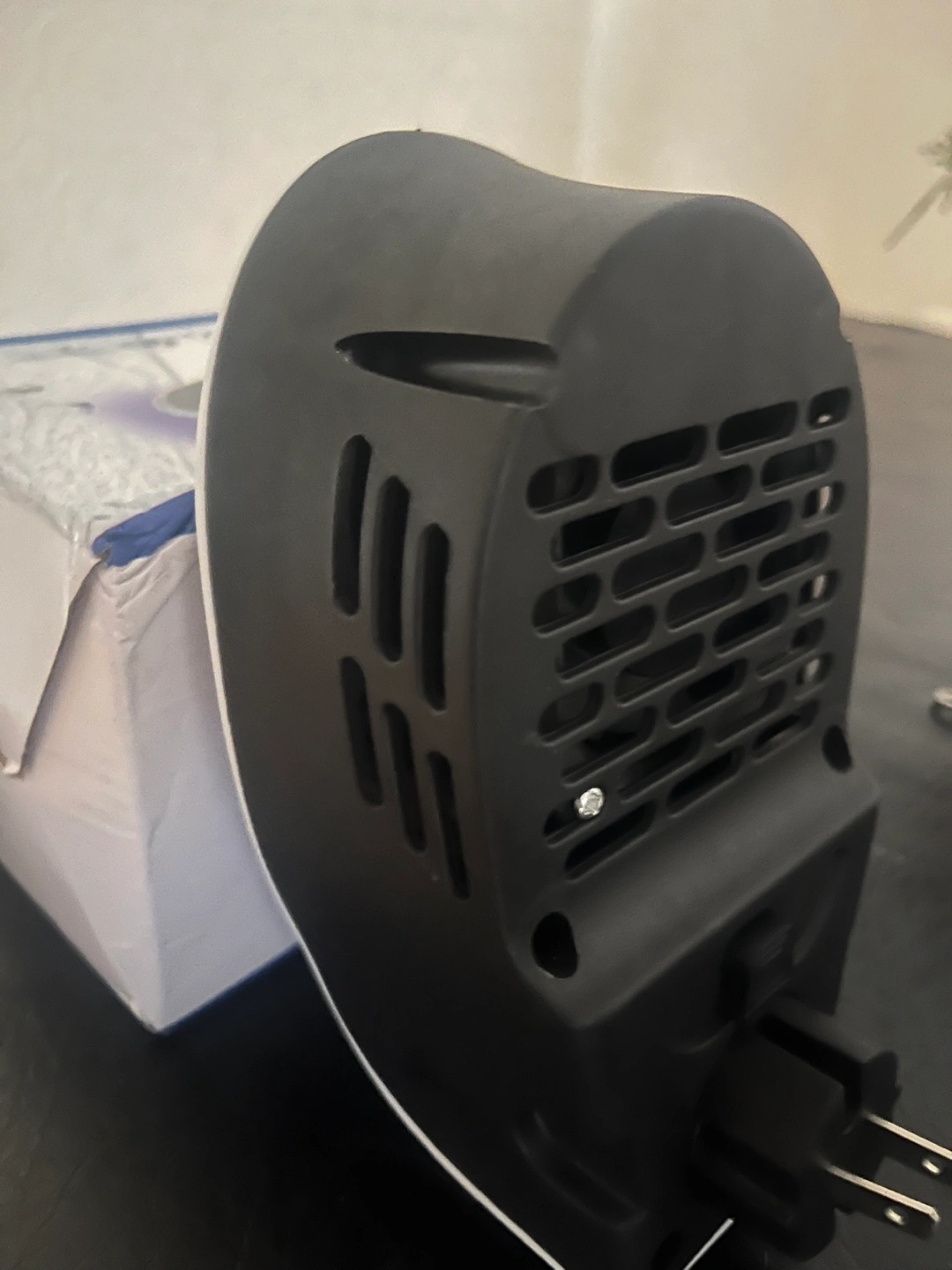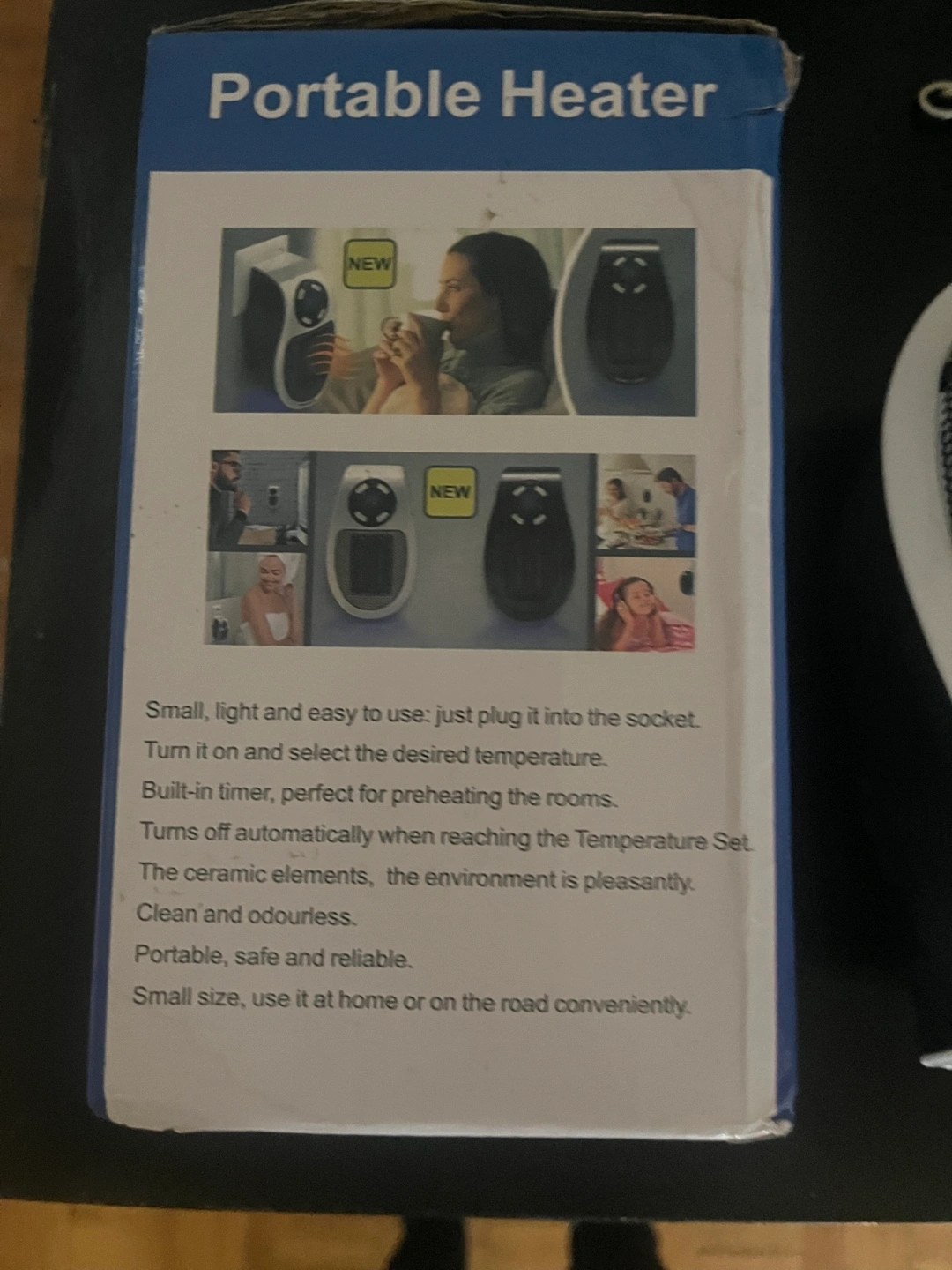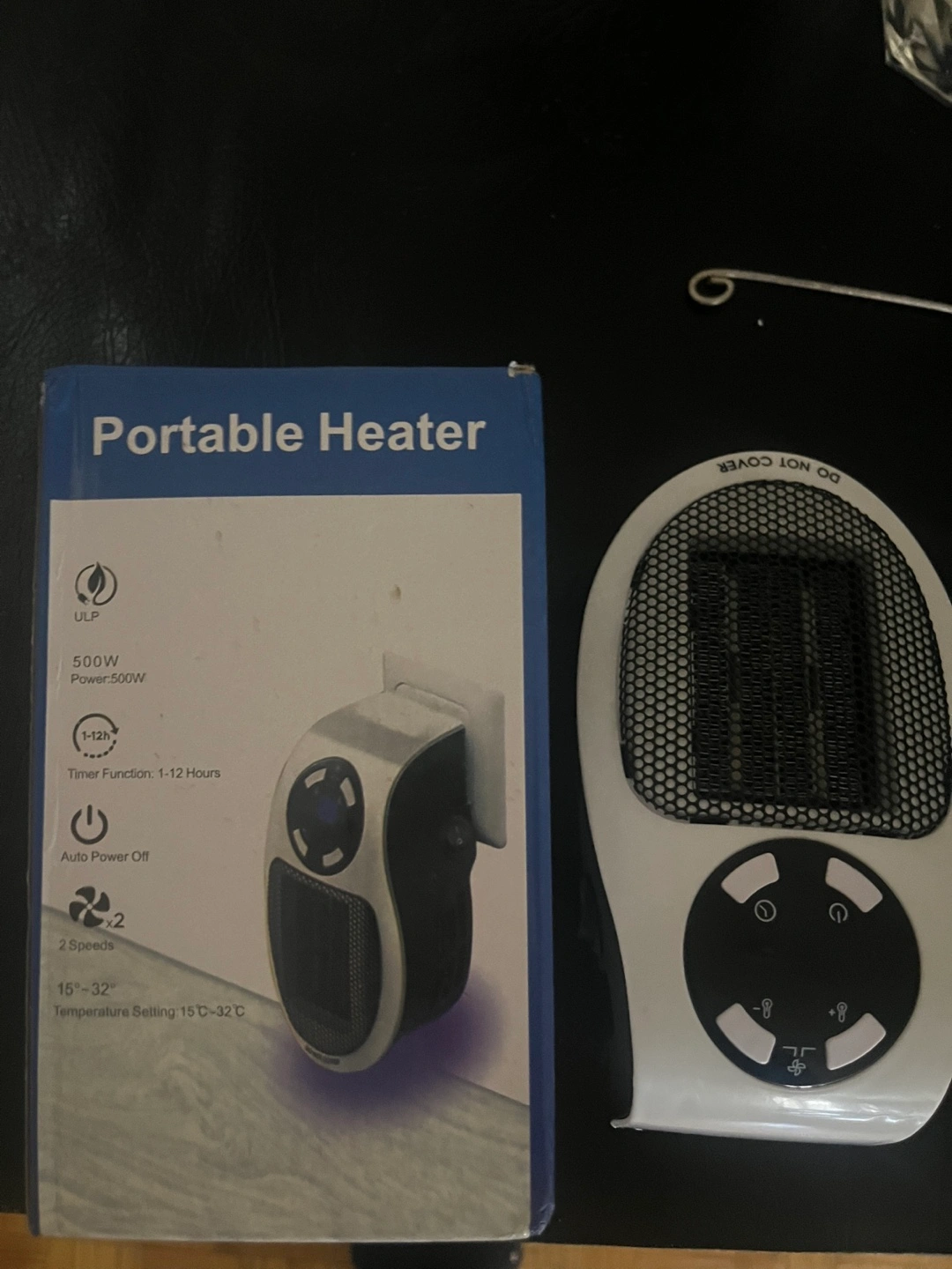 Compact and portable electric heater. Features 2 speeds, adjustable thermostat (15-32°C), and a 1-12 hour timer. Auto power-off function. Wall-mountable.