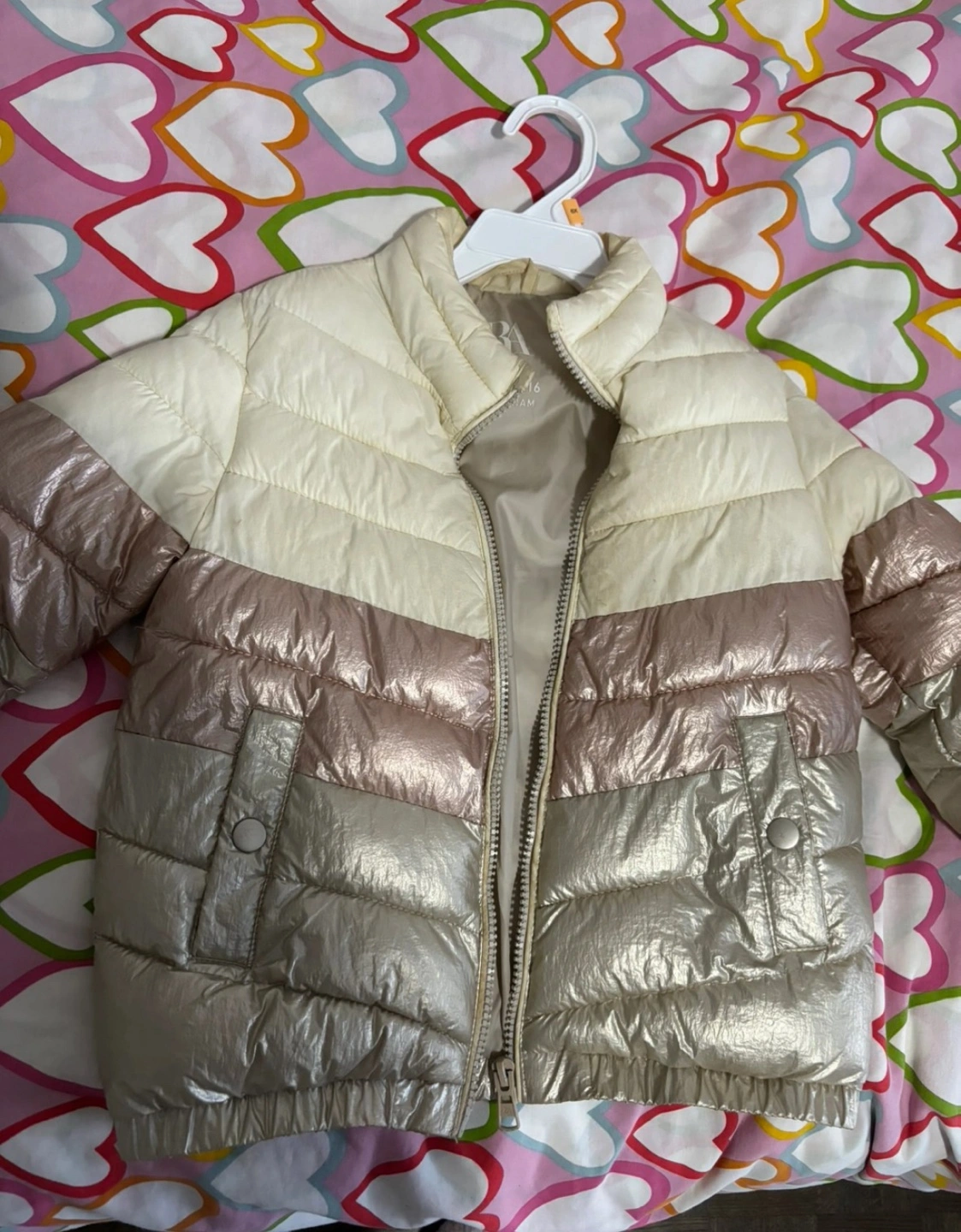 Rose gold and cream colour block design. Lightweight puffer. Zip closure. Two pockets.