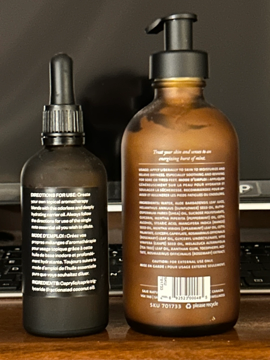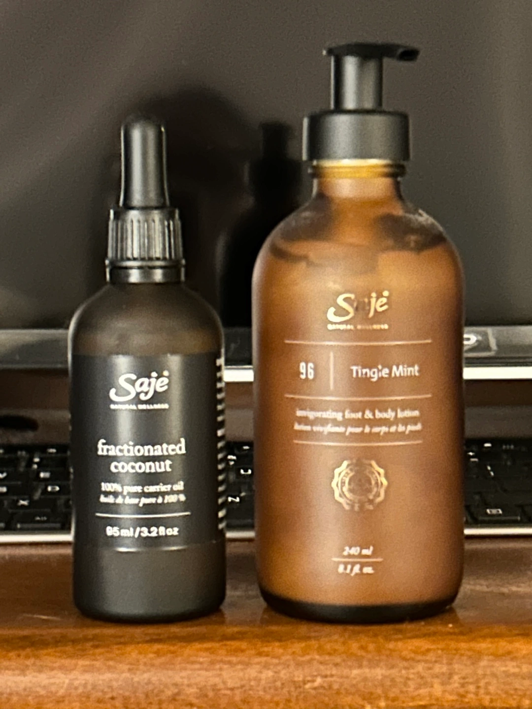Saje Natural Wellness products. Includes a bottle of fractionated coconut oil 95ml and a pump bottle of Tingie Mint lotion 240ml. $15 for the Oil, $20 for the Cream, $30 for the set