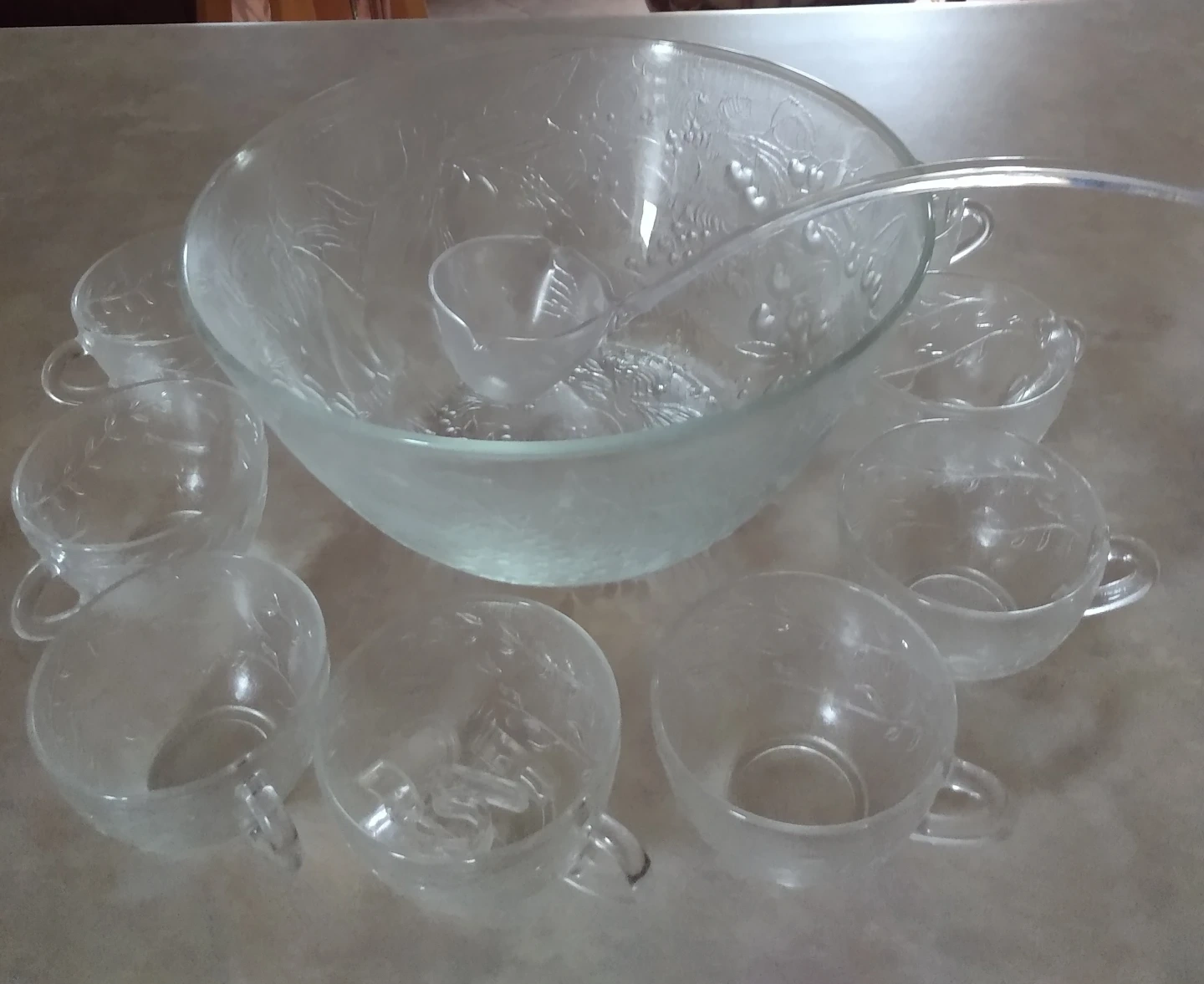 Beautiful vintage punch bowl set. Includes a large glass bowl with etched design, eight coordinating cups, and a plastic ladle. Perfect for parties or special occasions. (Cash pick up)