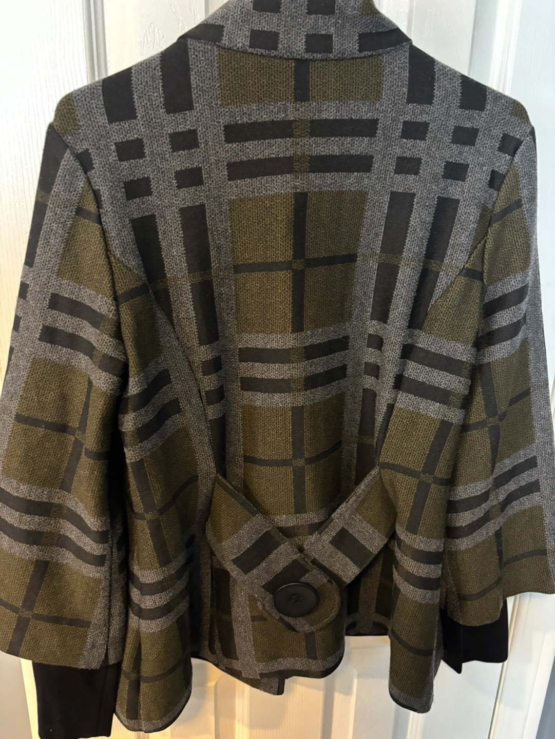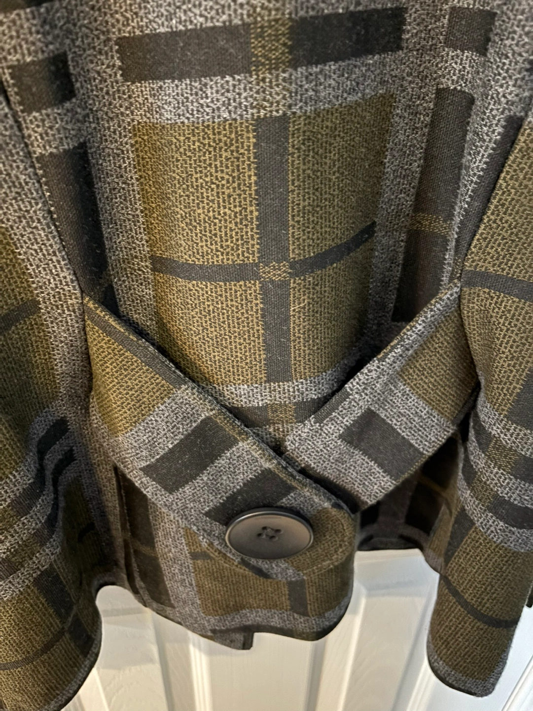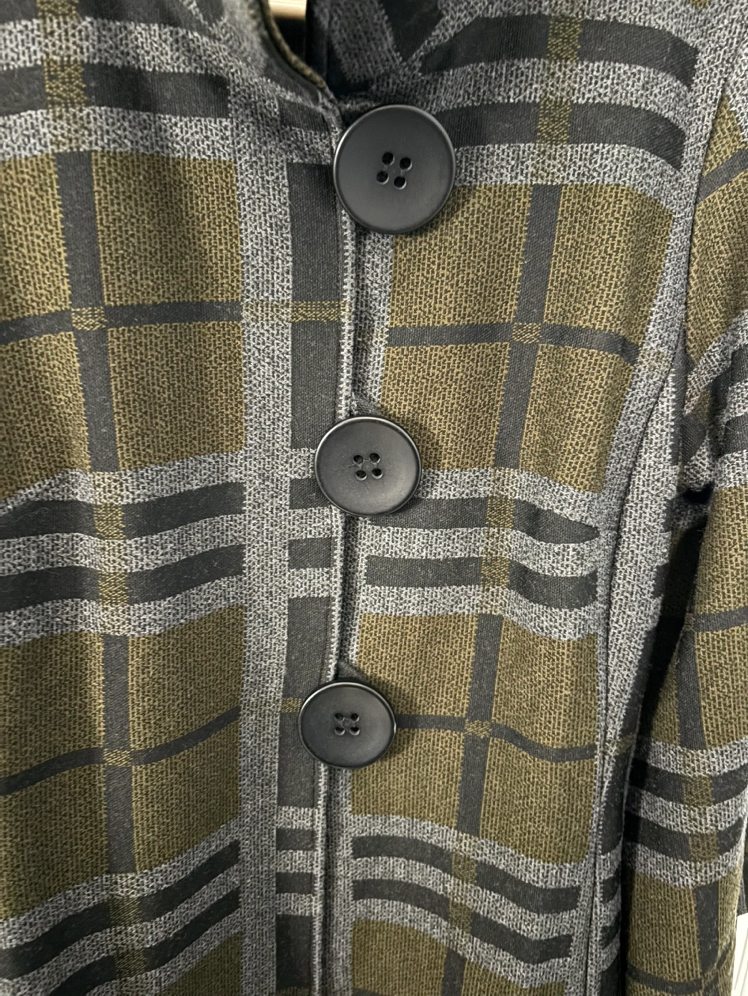 Stylish jacket. Green and grey plaid pattern. Three large black buttons. Made in Canada.
