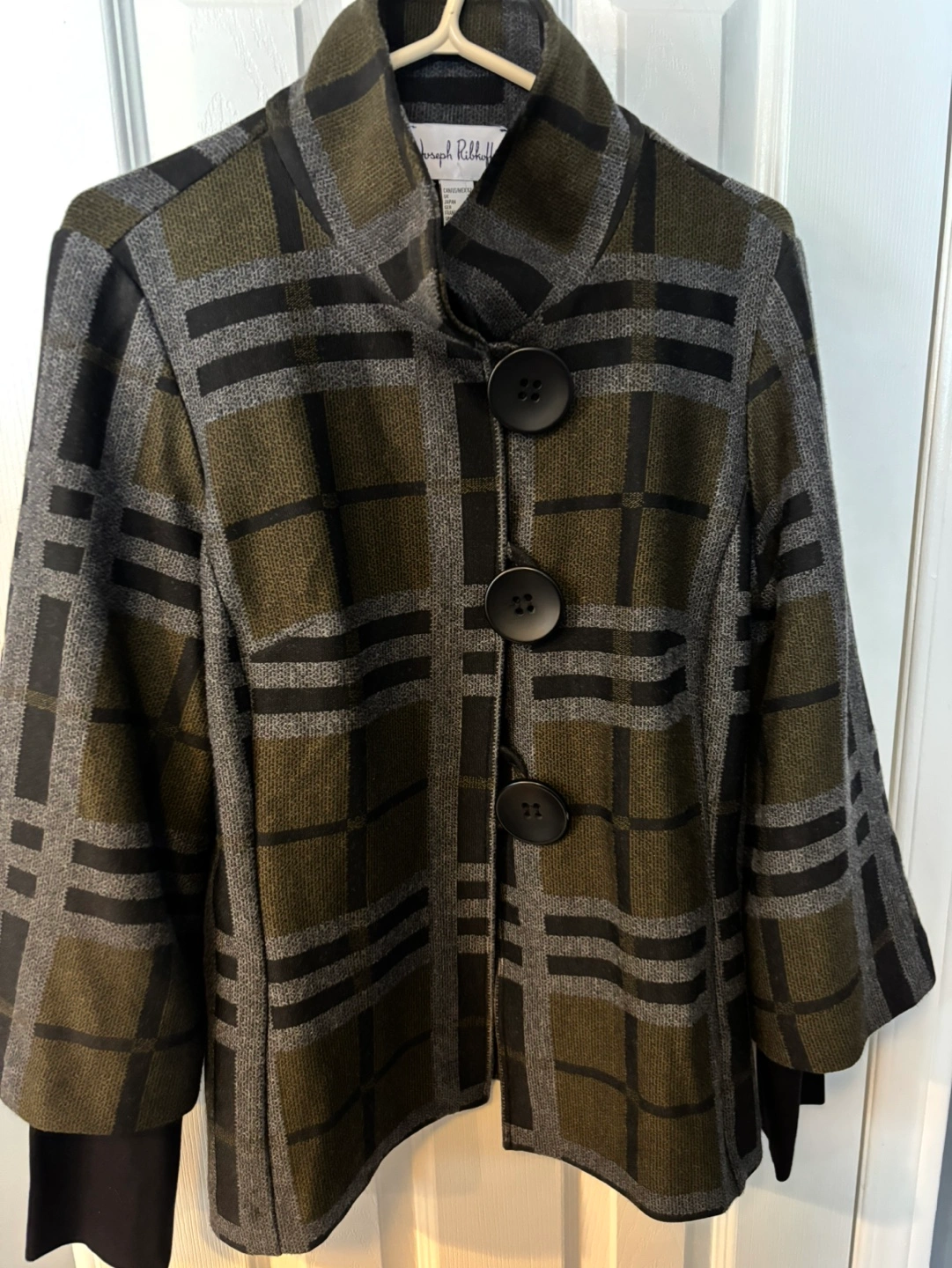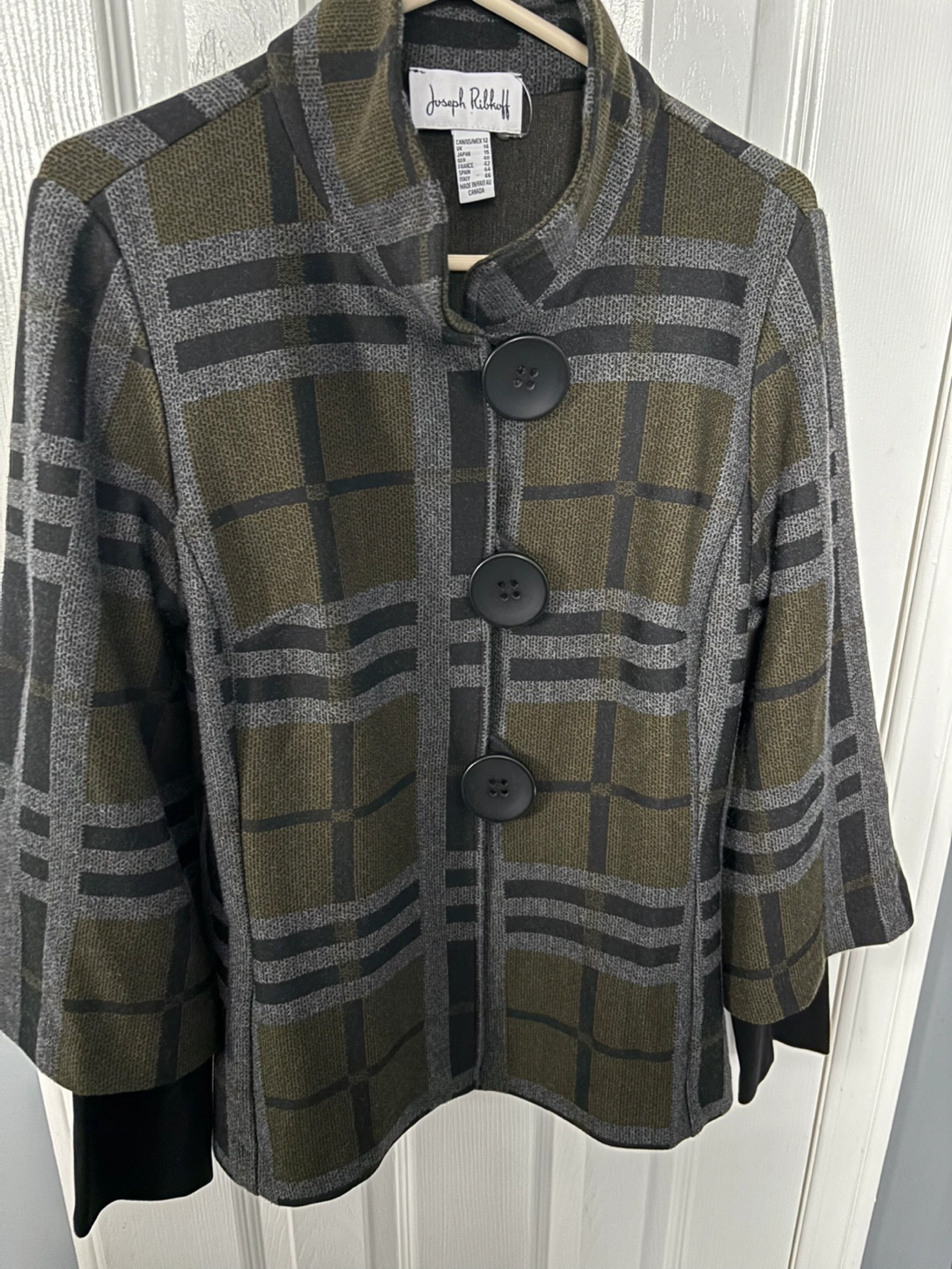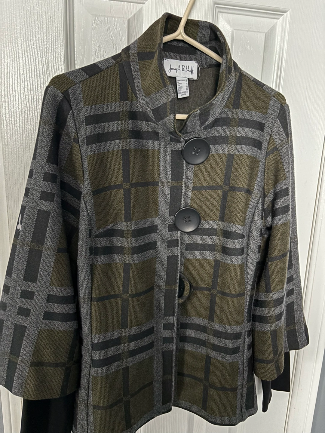 Stylish jacket. Green and grey plaid pattern. Three large black buttons. Made in Canada.