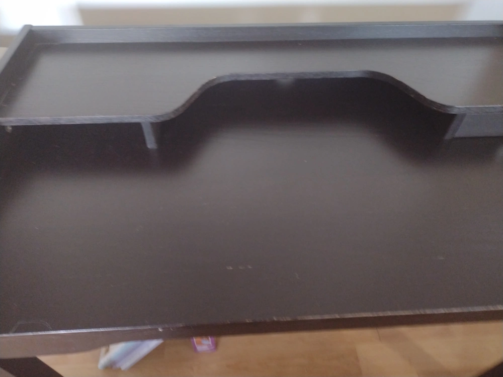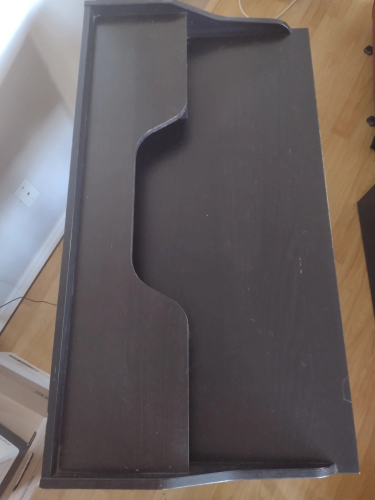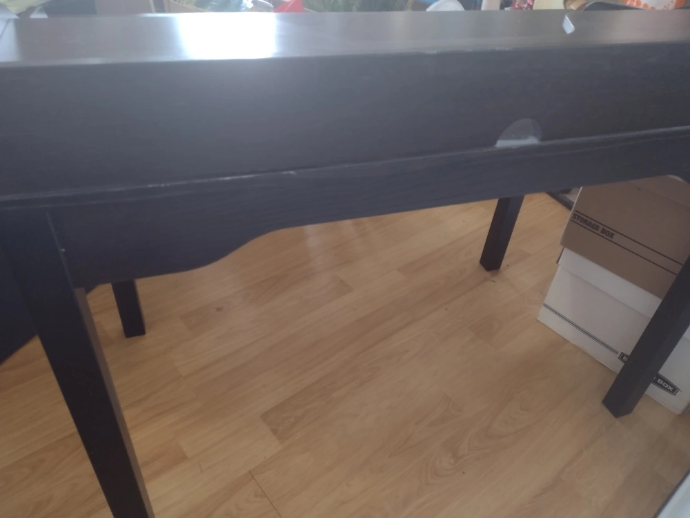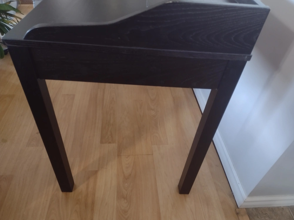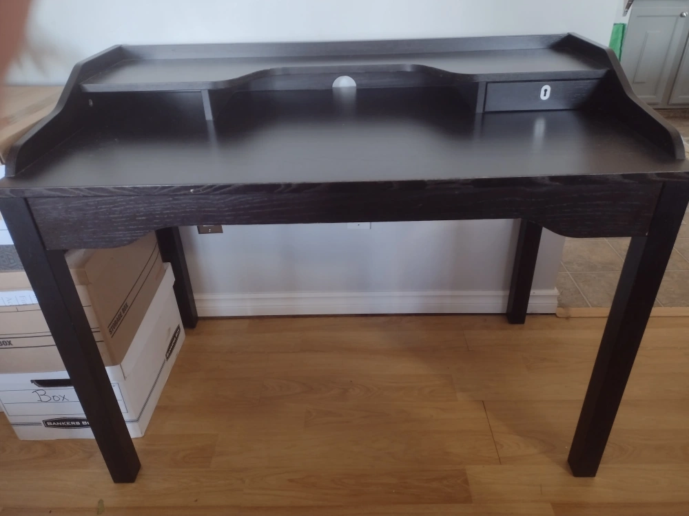 Writing/Student/Office desk. Black finish with small drawer non functional. Streamline design and solid. Work surface heigth of 29.25". Smoke free environment.