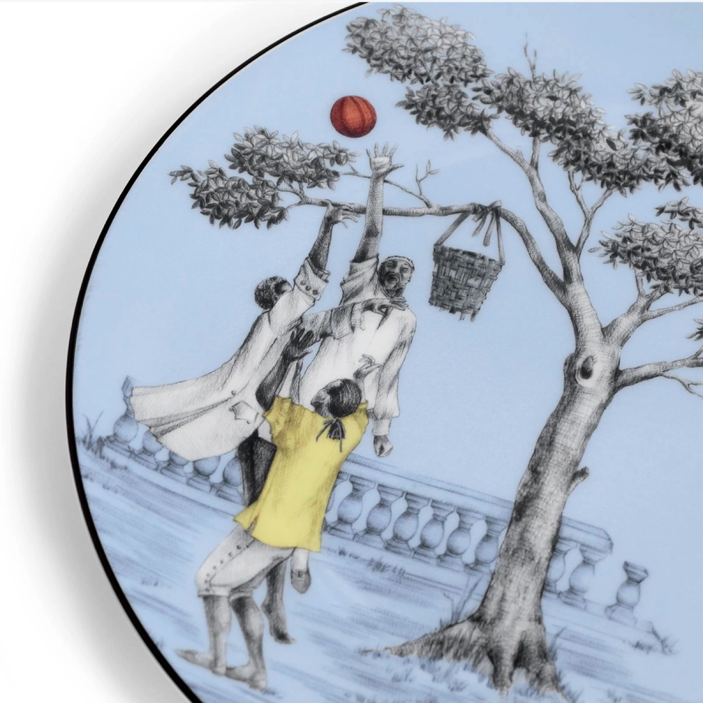Wedgwood x Sheila Bridges Accent Plates. Light blue background with beauty details.