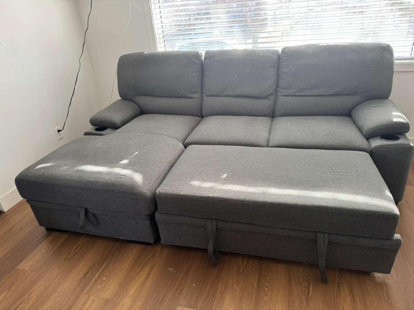 Features pull-out bed, storage ottoman and cup holders.