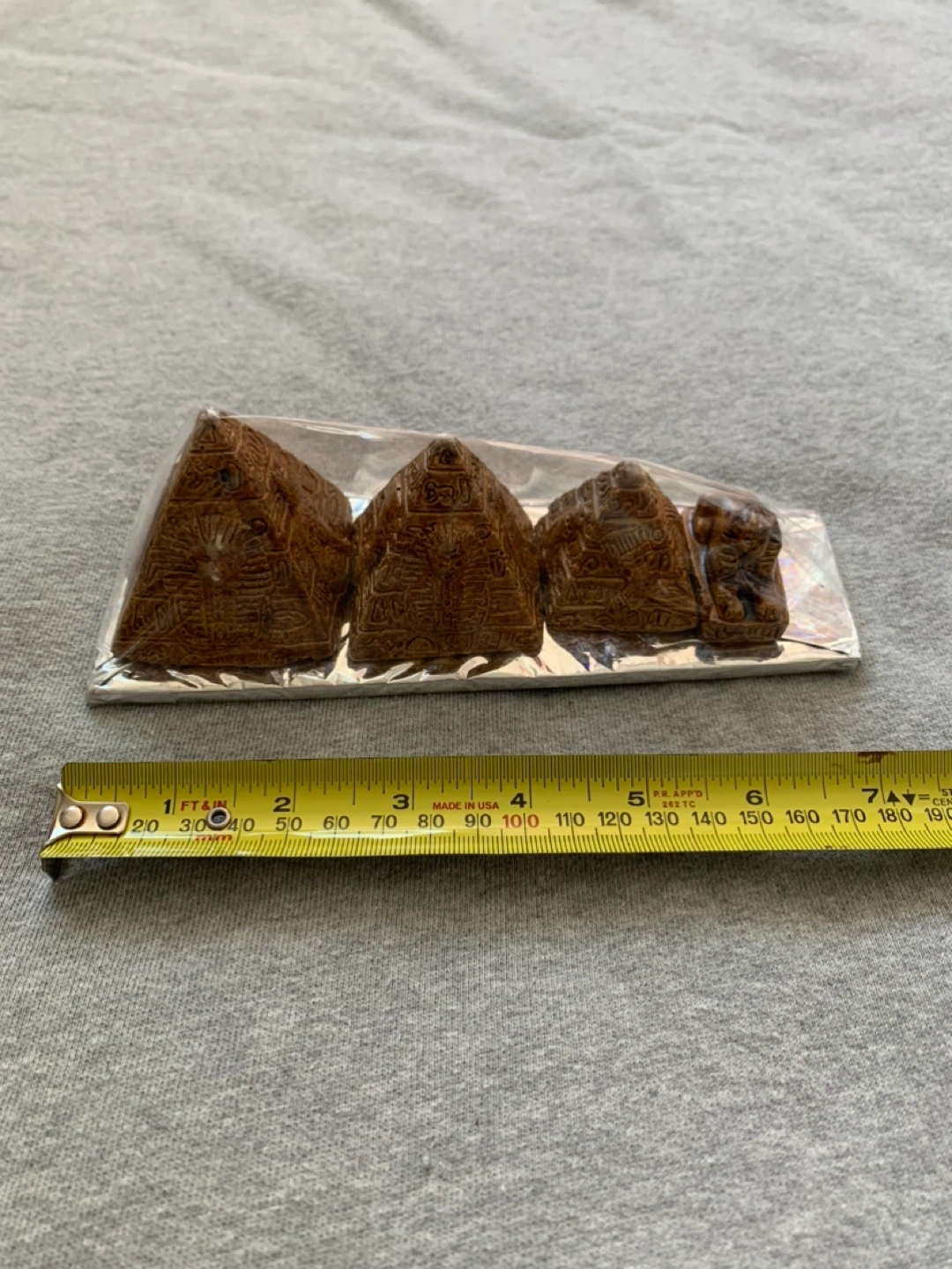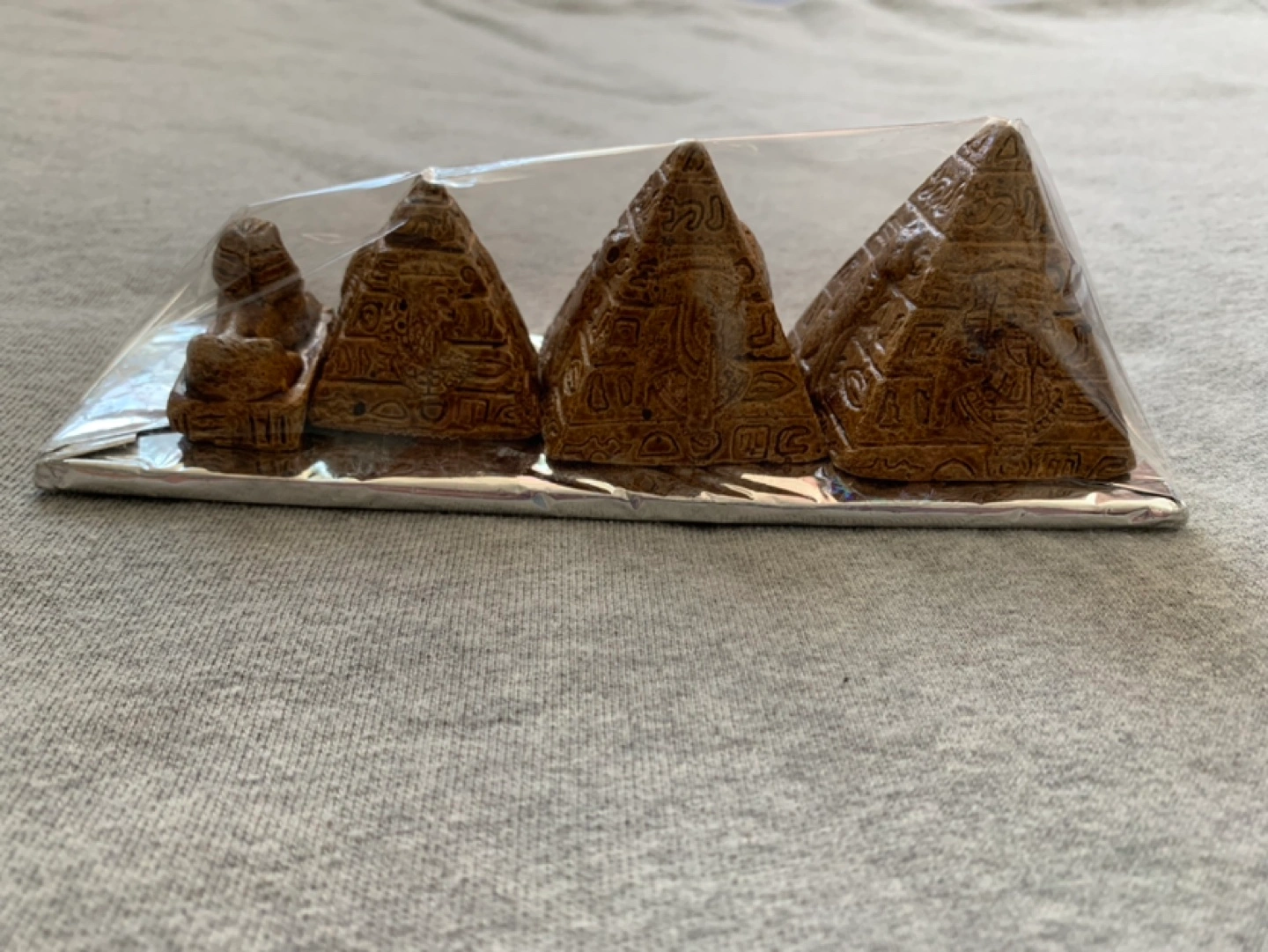 Set of three miniature pyramids and a sphinx. Brown colour. Detailed carvings. Packaged in plastic. Souvenir style. Purchased in Cairo