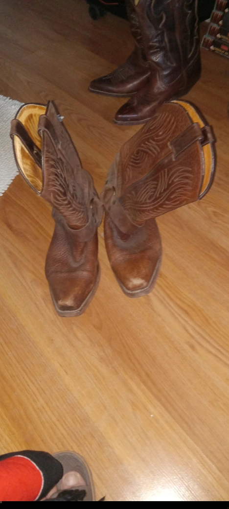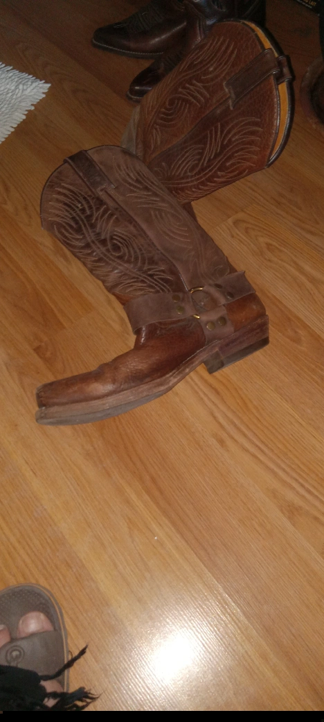 Pair of used brown leather cowboy boots. Features intricate stitching and a classic design. Good for everyday wear or special occasions. Some wear and tear present.