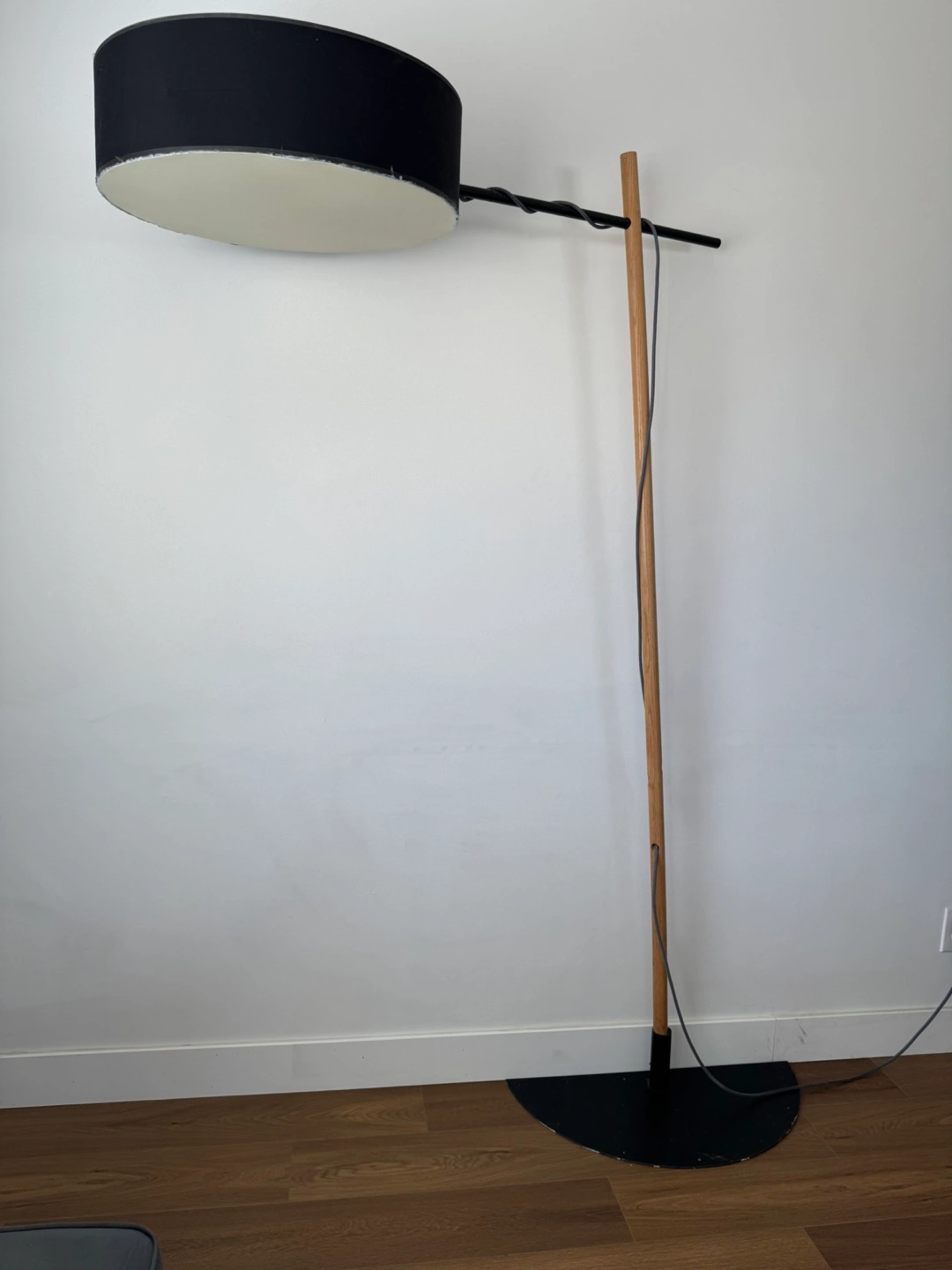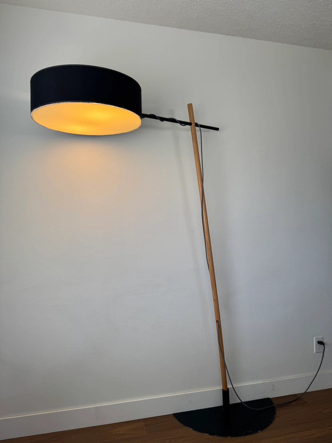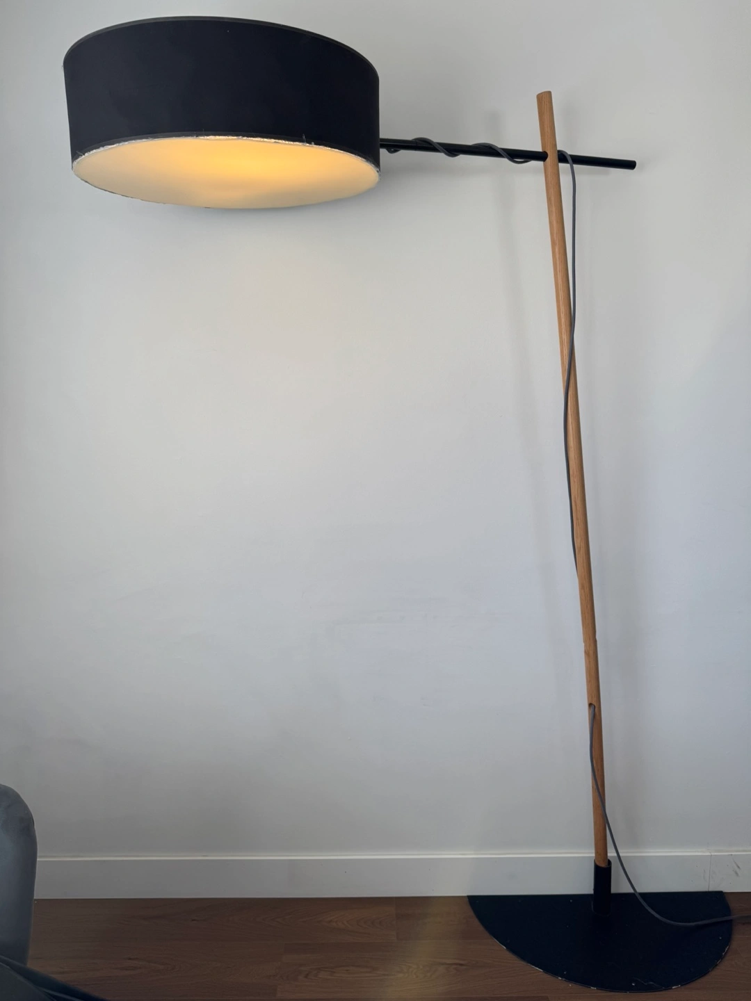 Stylish arc floor lamp. Features a black fabric shade, wooden stand, and a black metal base. Provides ambient lighting. Great for living room or bedroom.