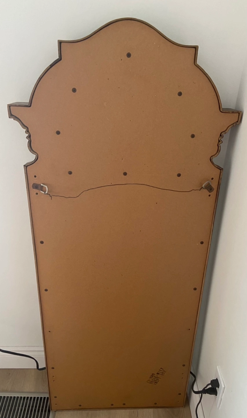 Unique Lightweight Tall Mirror in nice bronze coloured plastic frame. Features an arched top and detailed carvings in great condition with some minor paint chips on the frame. Perfect for adding a touch of elegance to any room.