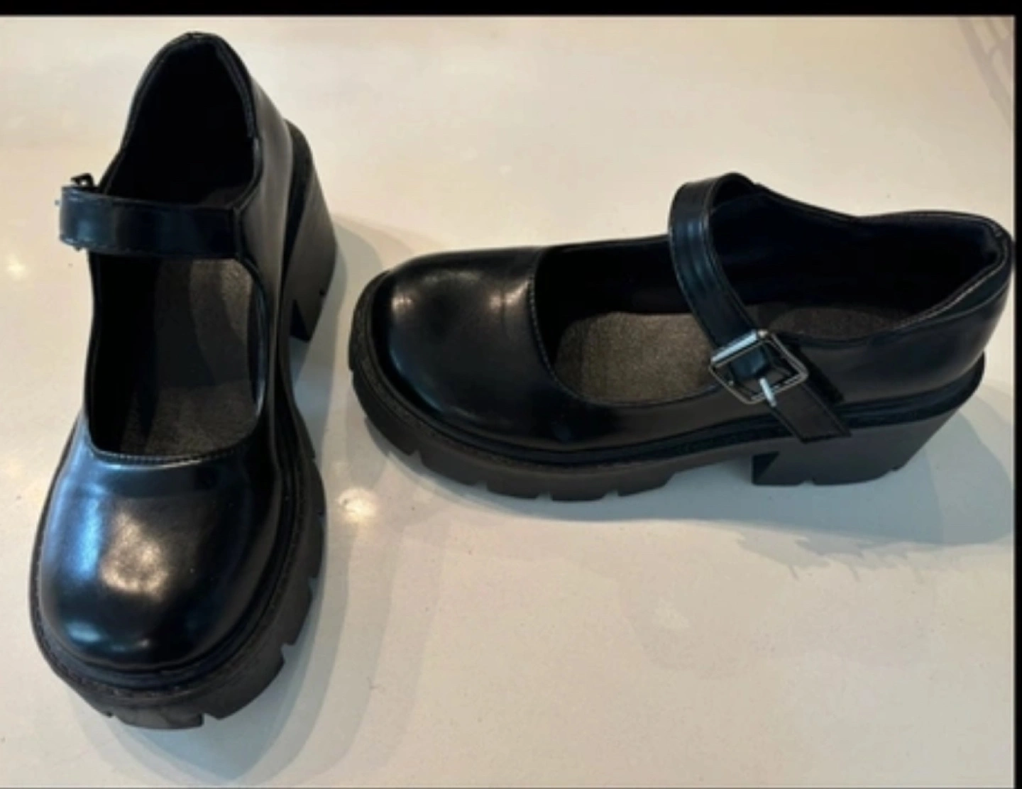 Pair of black platform Mary Jane shoes. Features chunky heels and a buckle strap. Faux leather.