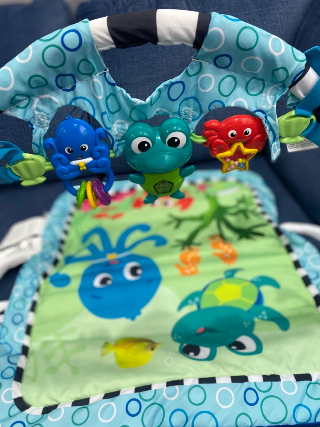 Adorable baby playmat featuring an ocean theme. Includes a supportive arch with hanging toys. Soft, colourful design. Great for tummy time and playtime.