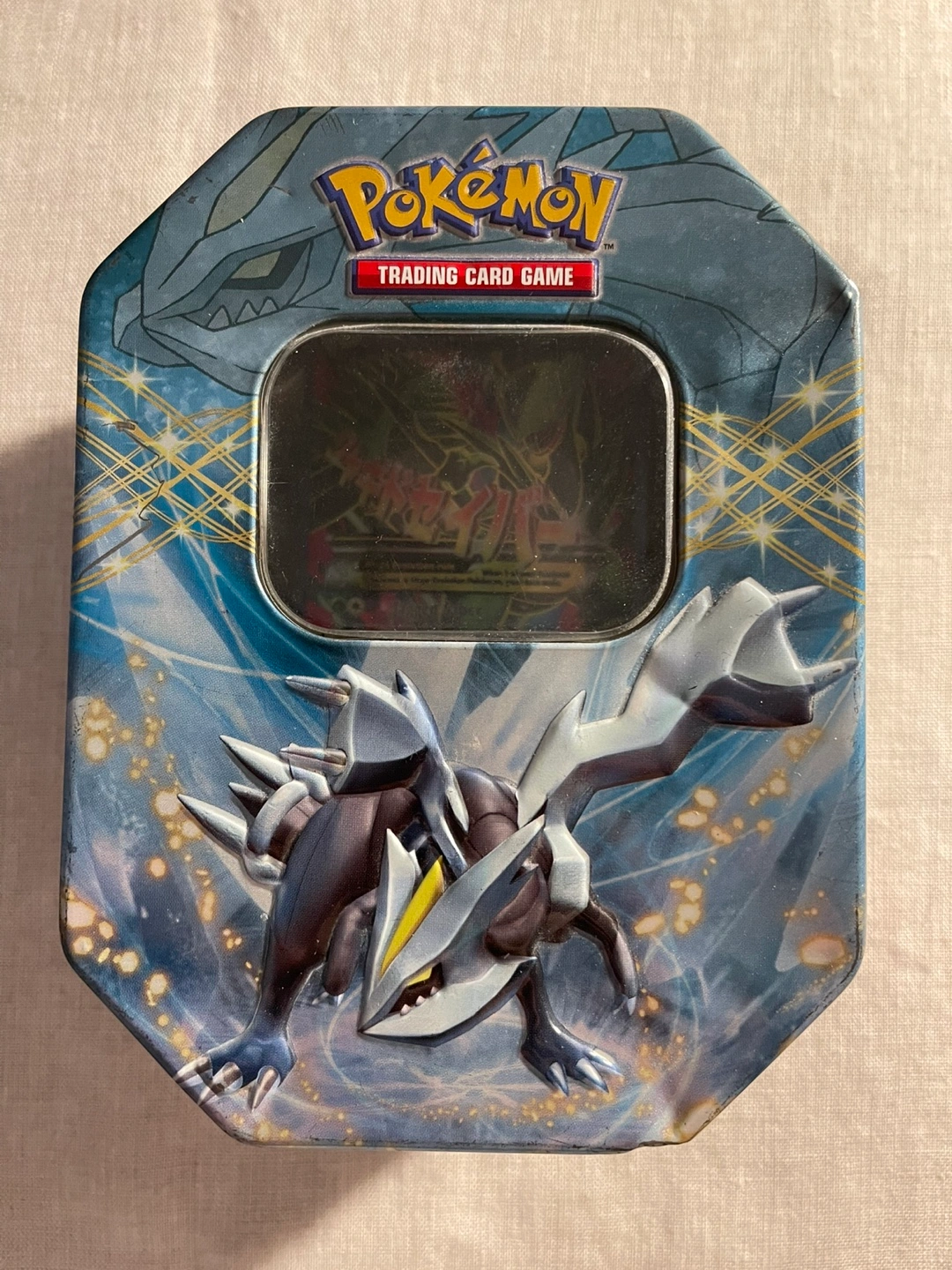 Pokemon metal tin featuring a Pokemon illustration. Includes a collection of Pokemon trading cards. Great for collectors or players.
