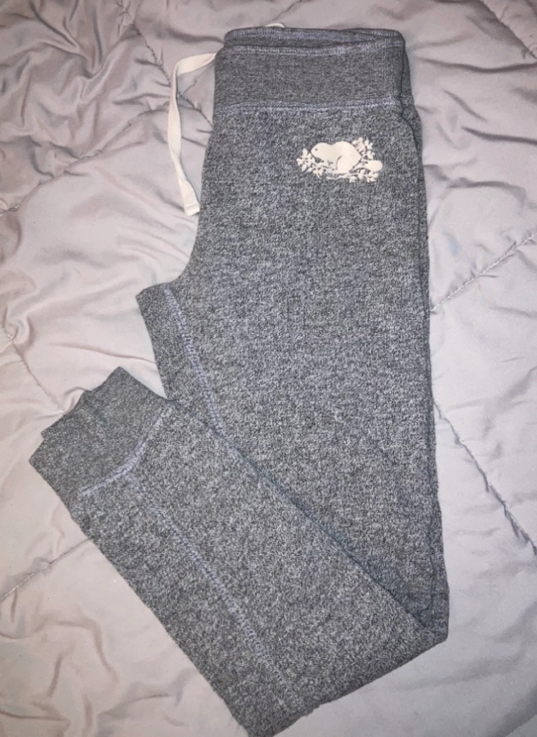 Grey joggers with Roots logo. Size small. Soft material. Good condition. Drawstring waistband. Cuffed ankles.