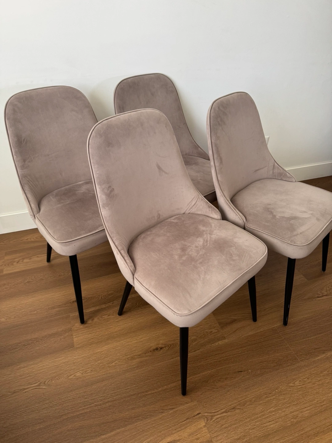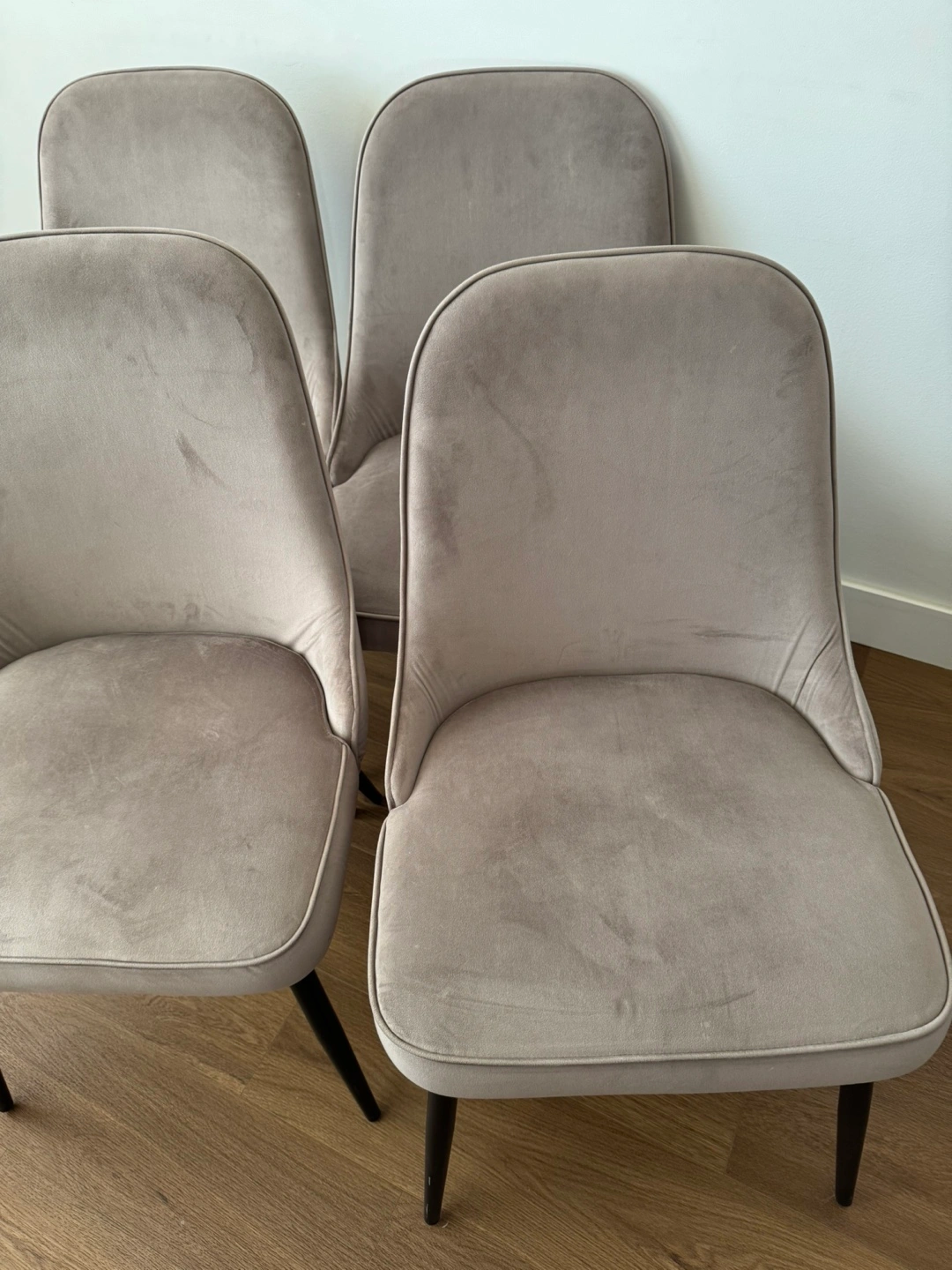Set of Four Grey Velvet Dining Chairs with Black Legs
