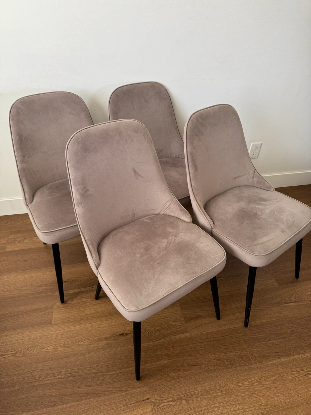 Four grey velvet dining chairs. Black tapered legs. Mid-century modern style. Great for a dining room or kitchen.