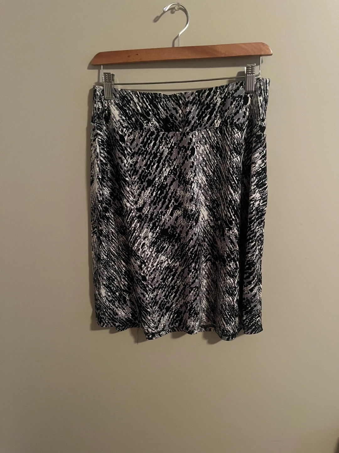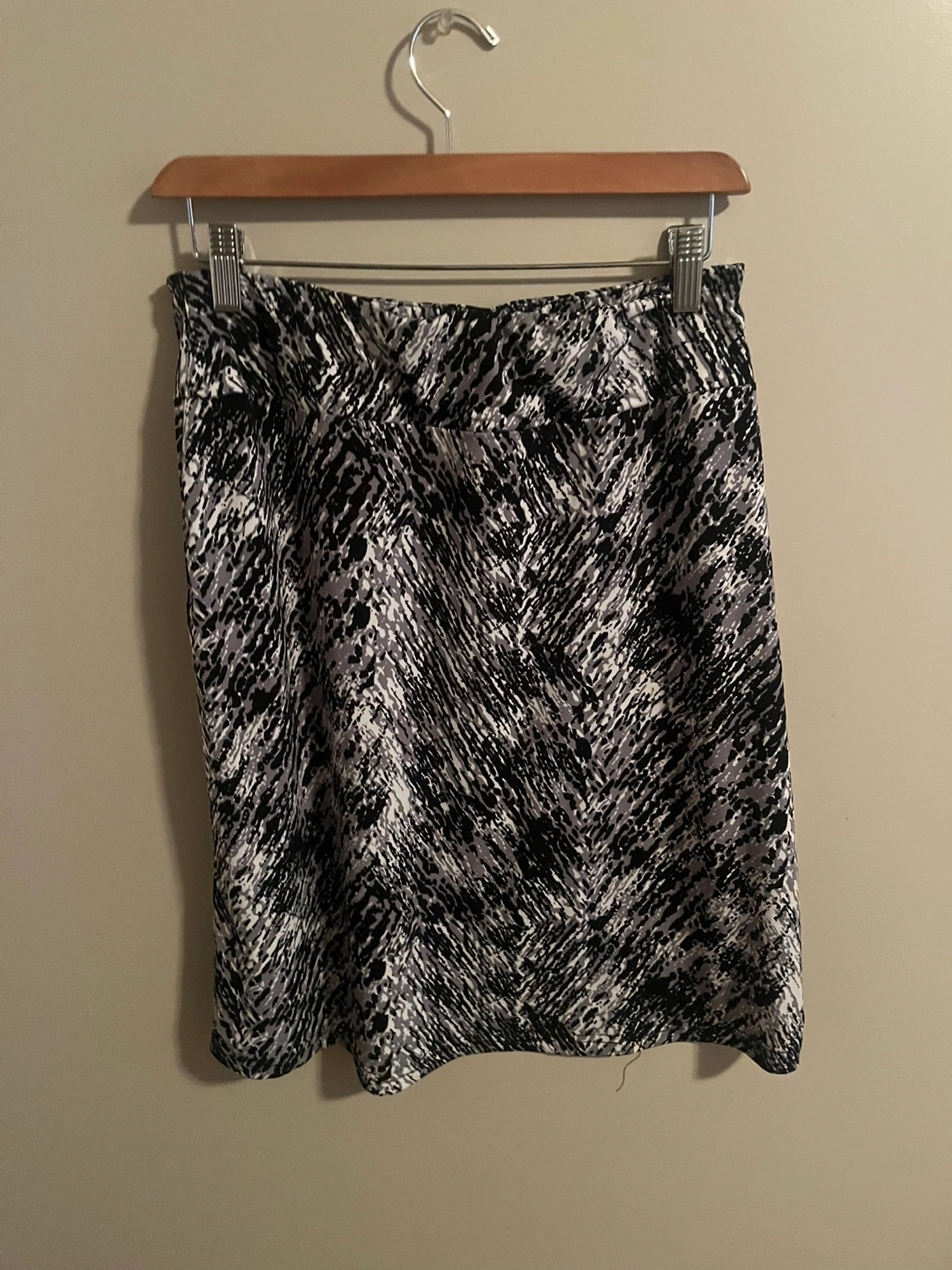 Stylish knee-length skirt. Features an abstract black and white print. Pull-on style, comfortable fabric. Great for casual or semi-formal wear.