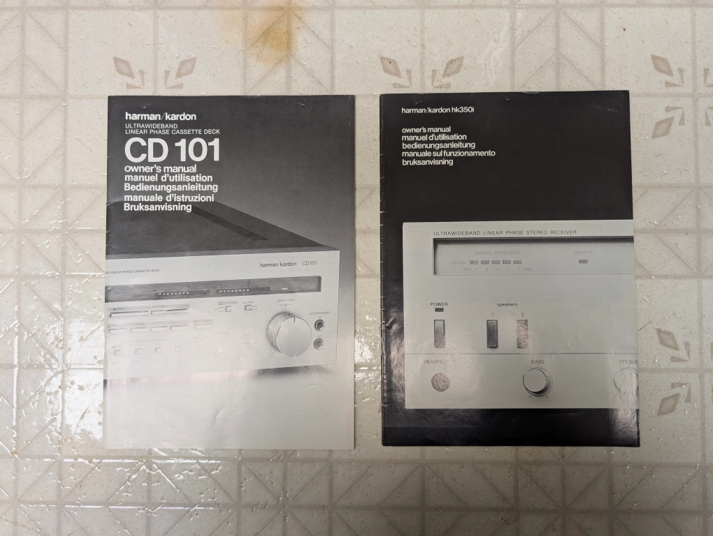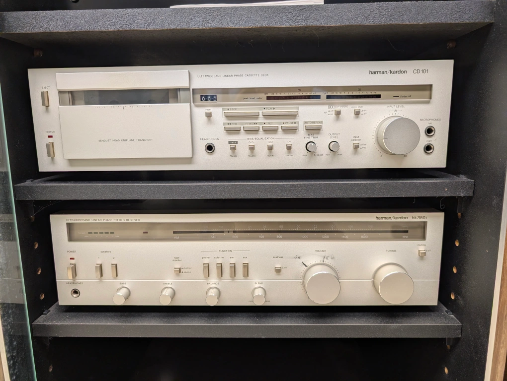 73Vintage Harman Kardon stereo system. Includes CD 101 cassette deck and HK 350 receiver. Both units in good. Owner's manuals included. Gently tested in Jan 2025, tape heads may need cleaning or replacement, but I am not an expert.
