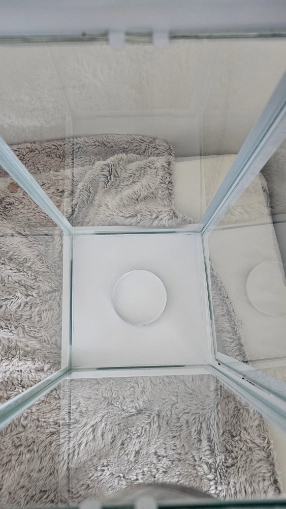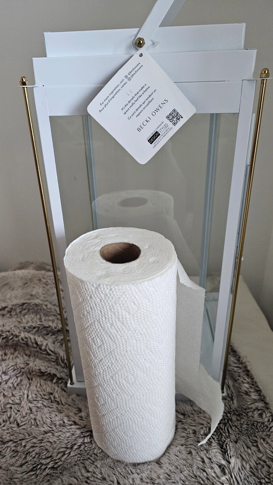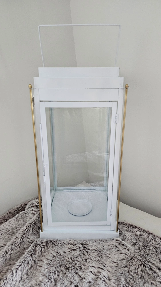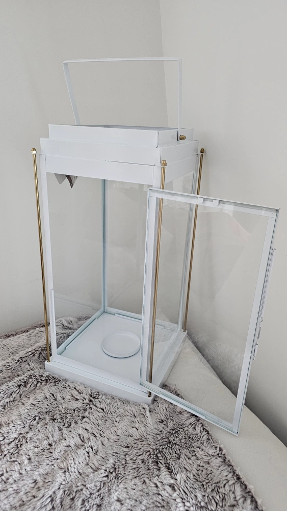 Large white metal lantern. Gold accents. Glass panels. Square base. Top handle. Suitable for candles or decor. Tags still on, didn't return on time. $60.