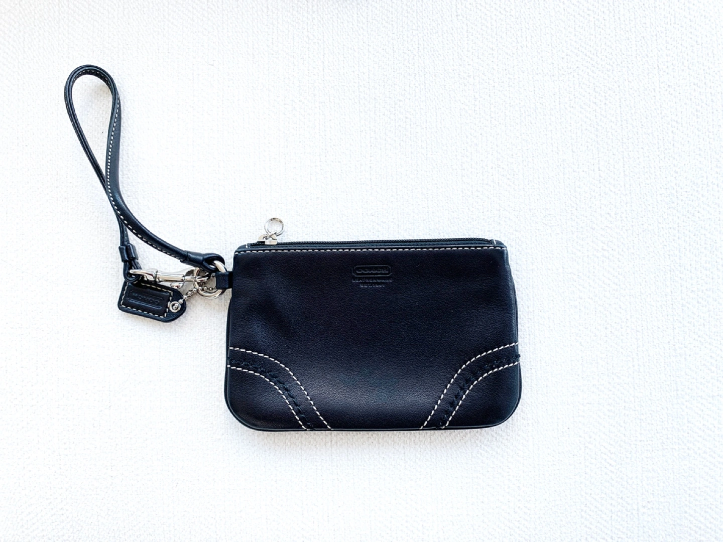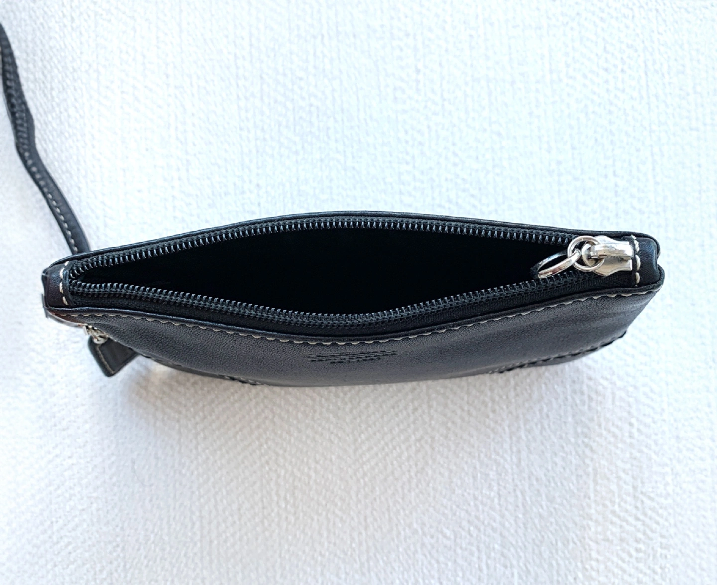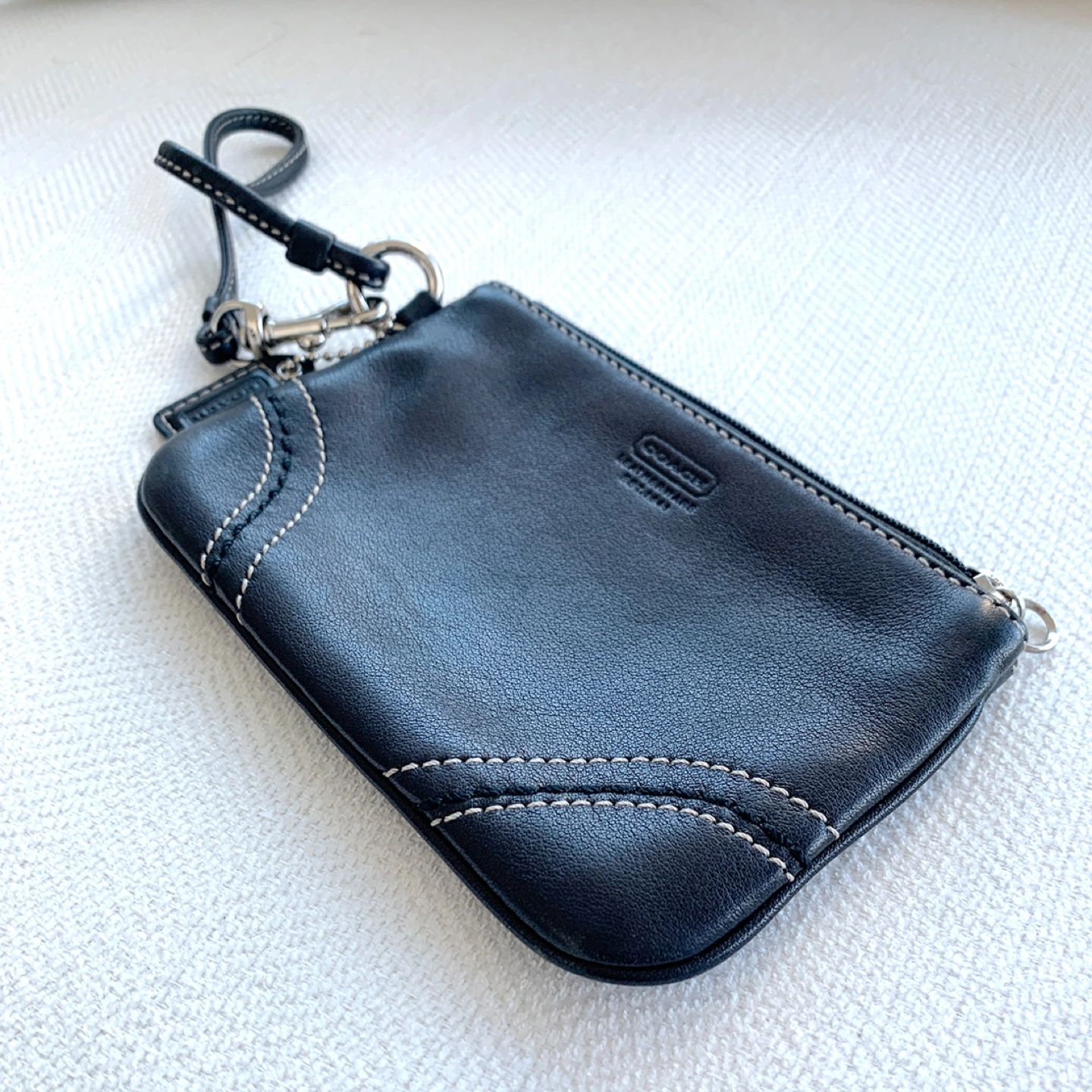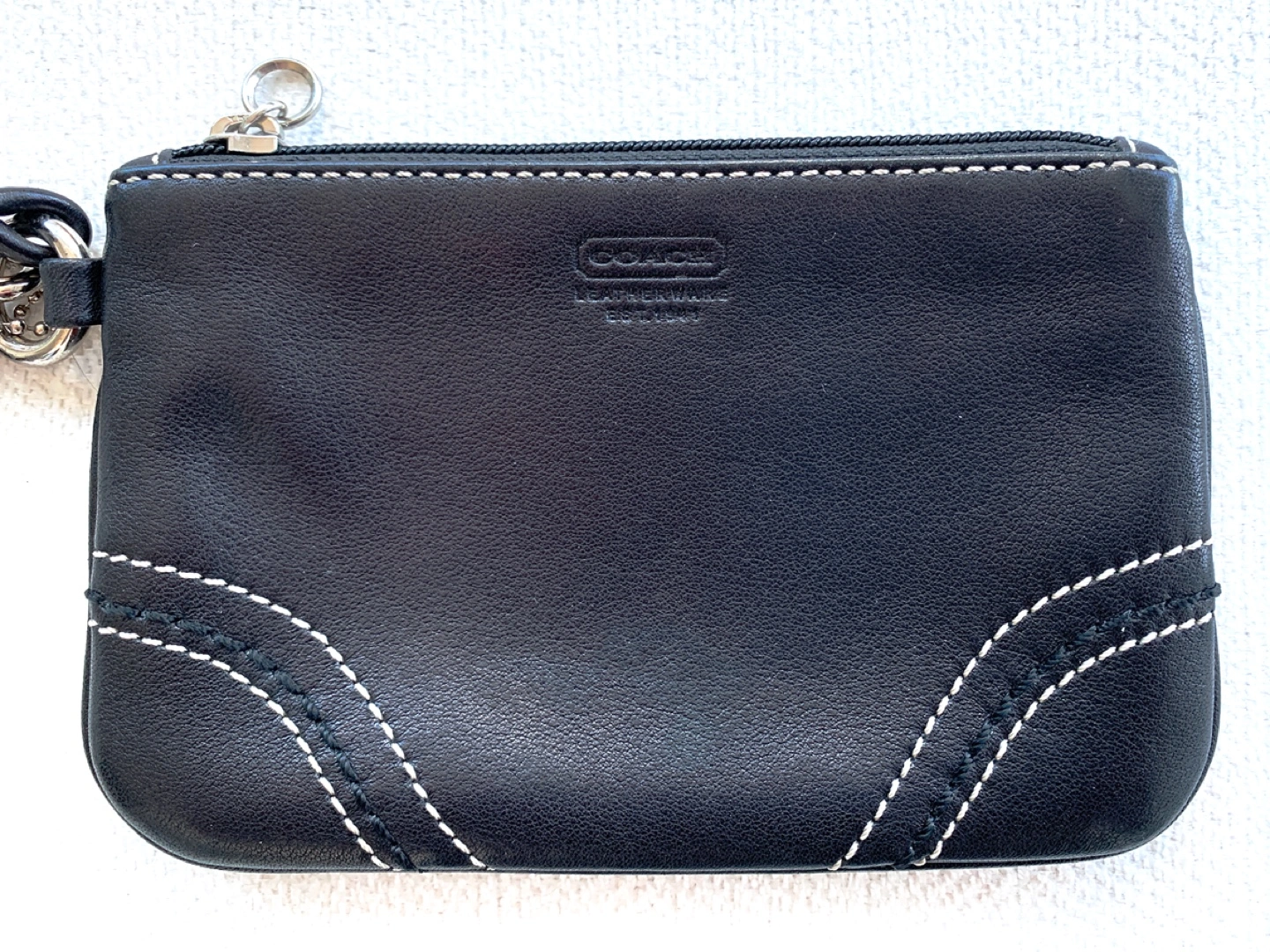Genuine Coach wristlet in classic black leather, perfect for a night out or quick errands! This elegant and compact accessory is crafted from high-quality leather, making it both stylish and durable. Features a convenient zip closure and wrist strap, plus just the right space for essentials like cards, keys, and your phone. In excellent condition with minimal signs of use—priced at $40 for a quick sale. Perfect for any Coach lover or anyone in need of a sleek, practical accessory!