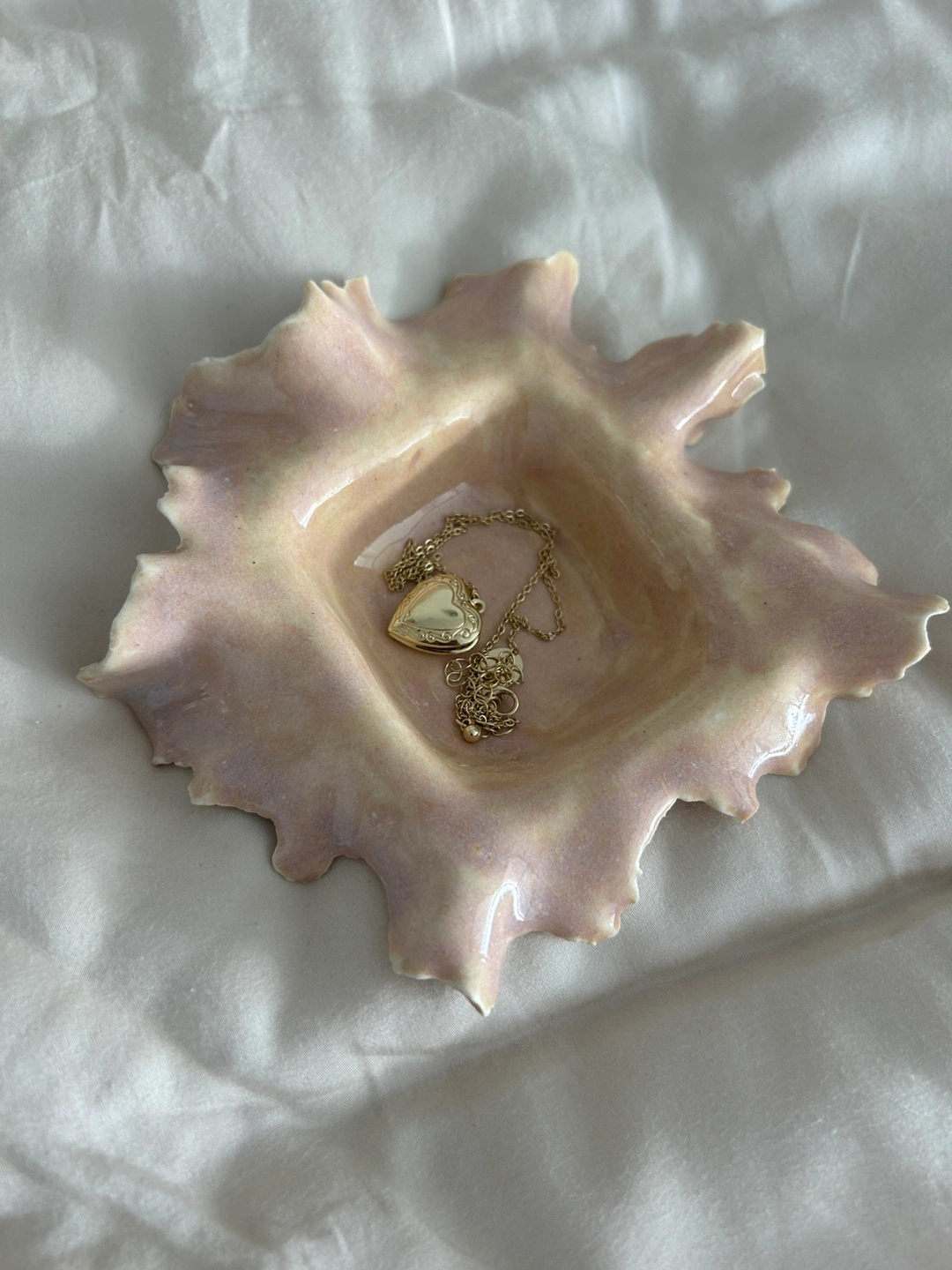 Small ceramic dish. Irregular shape. Pale pink and beige glaze. Perfect for jewellery or other small items. Handmade by me