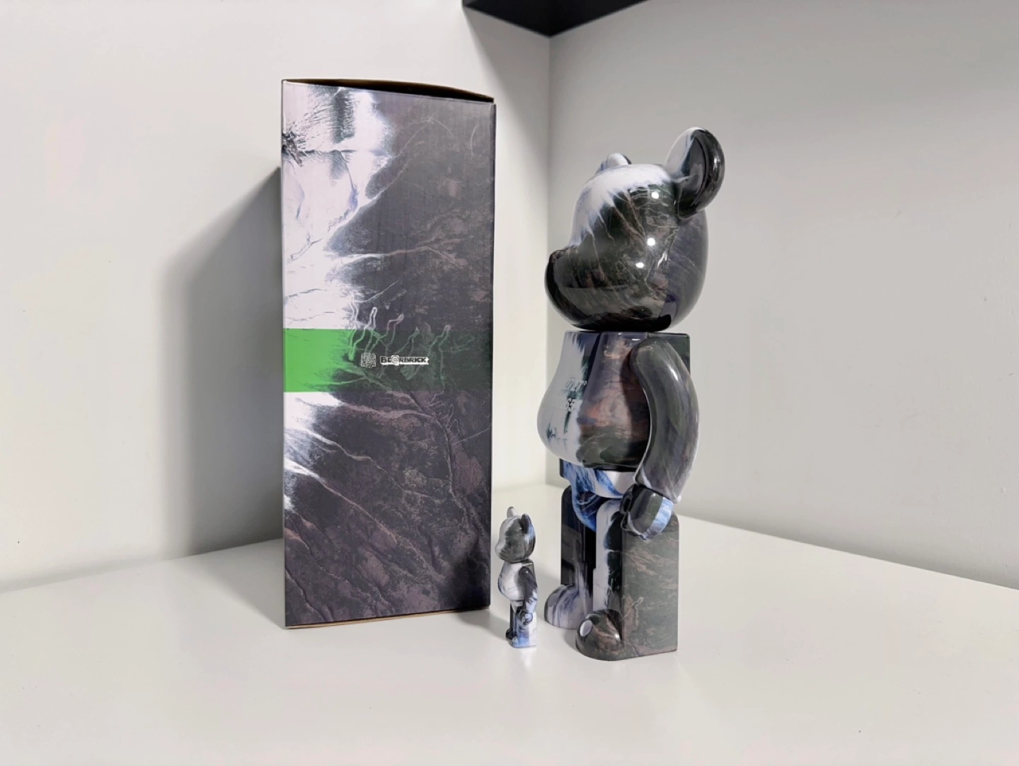 Bearbrick collectible figure set. Includes a 400% and 100% figure. Black and white marble design. Benjamin Grant Overview Mt Fuji, Japan collaboration. Comes with original packaging.