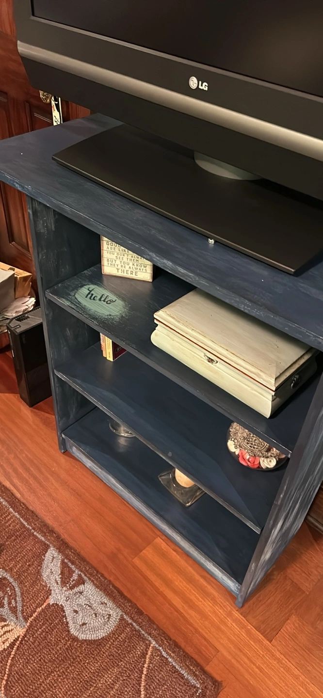 Three shelf plus to bookcase is an inky midnight blue and grayish blue for a rustic finish. Cute “hello” stencil on top shelf. It’s holding a large TV, so super sturdy. Measurements are 37” height; shelf depth 11 1/4”; top depth 16”; shelf width 27 3/4”; top width 36”. Holds a TV and other items. Open to offers.