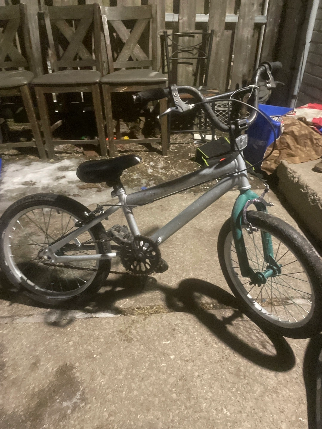 Silver kids' BMX bike. Suitable for younger riders. Shows some wear from use. Needs a bit of cleaning. Great for cruising around the neighbourhood.