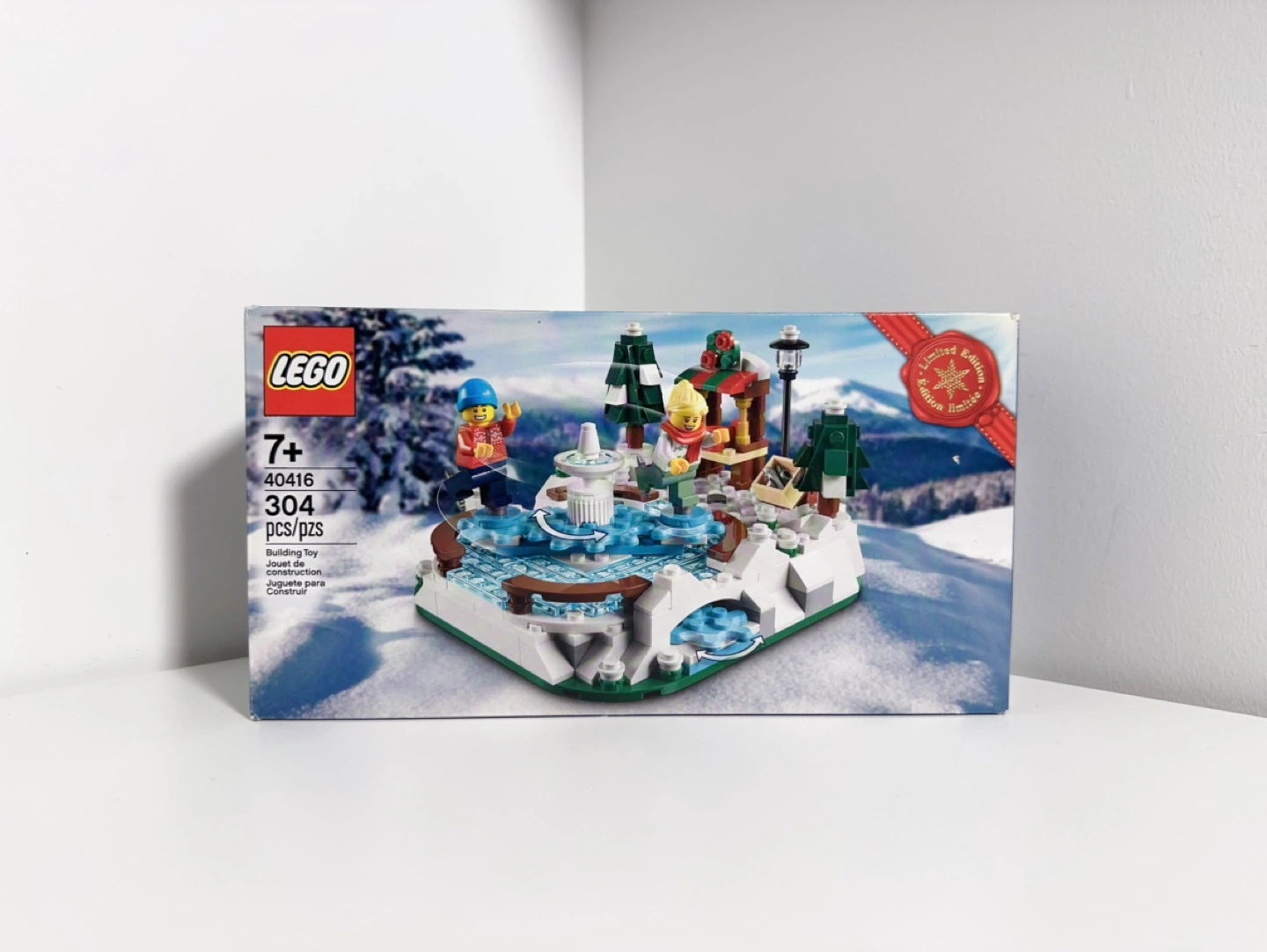 New in box LEGO set. 304 pieces. Ages 7+. Winter village theme. Features ice rink, figurines, and festive details. Collector's item.