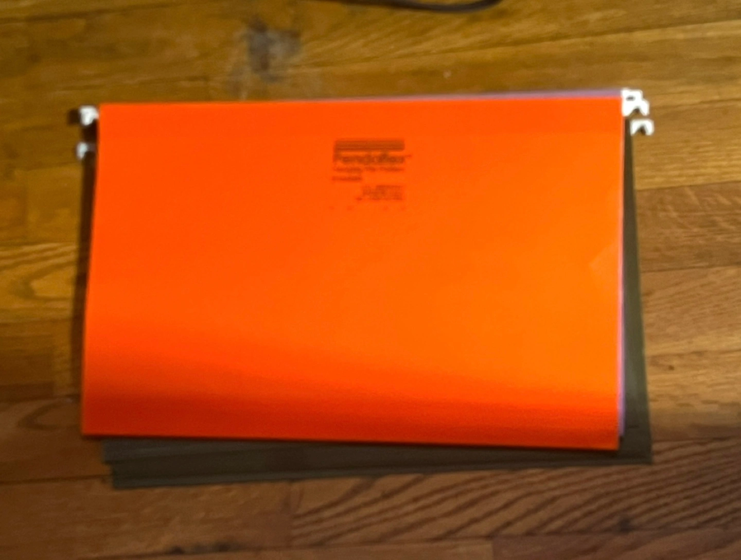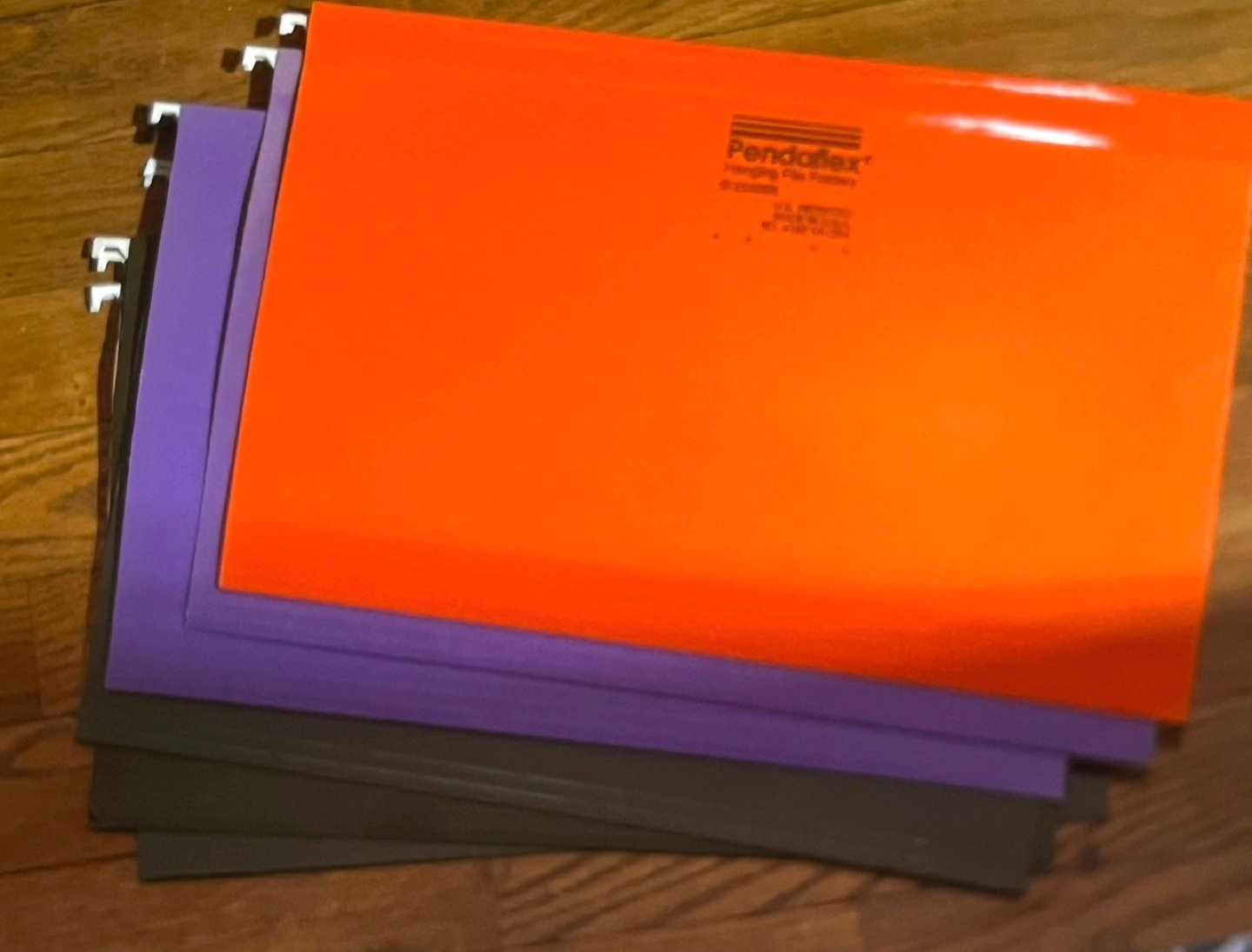 Seven legal length hanging file folders. Colors include one orange, two purple, and four green. Approximately 15” long and 9 1/4 high. Good for organizing documents. Free for pickup on the UWS