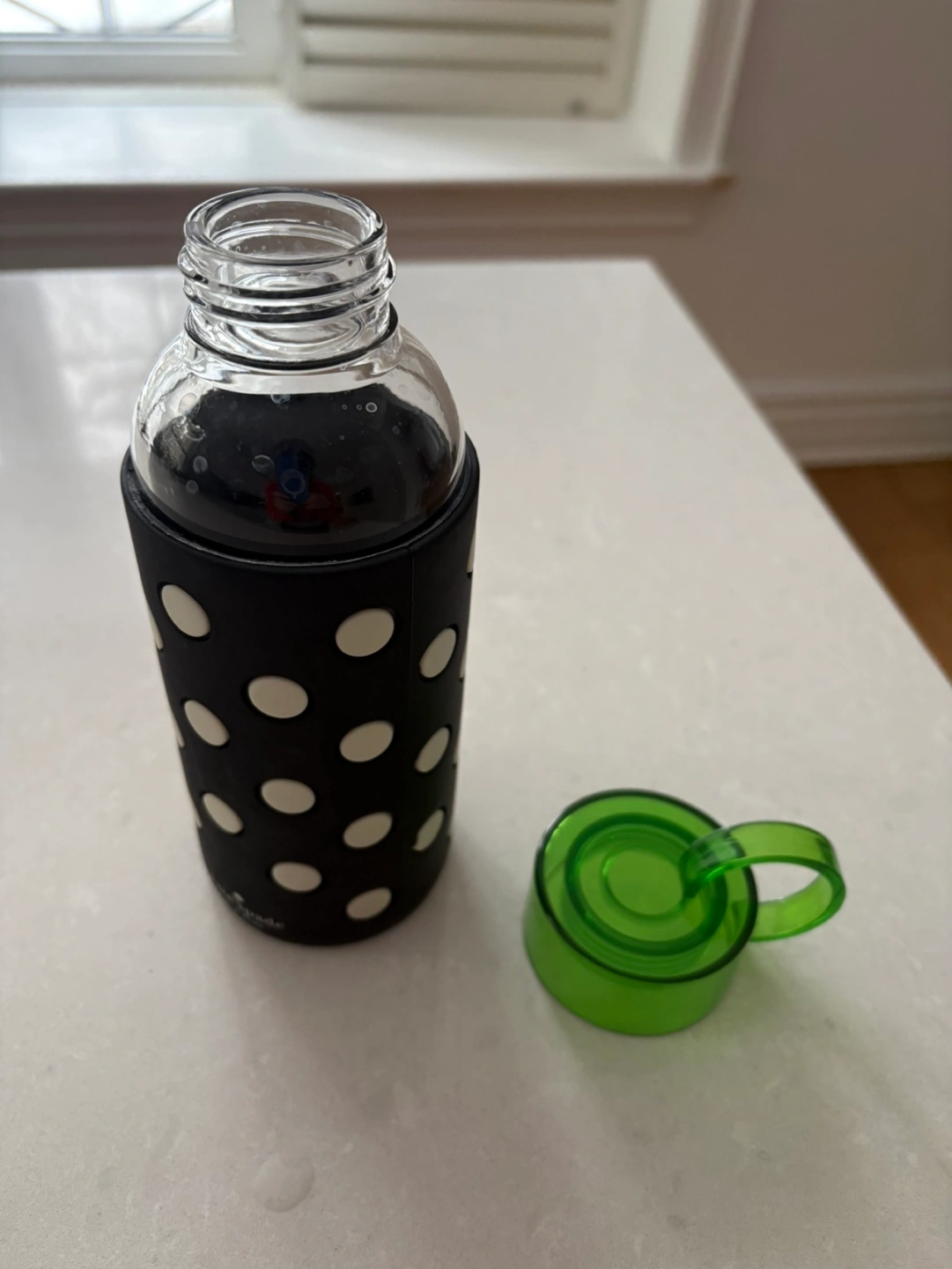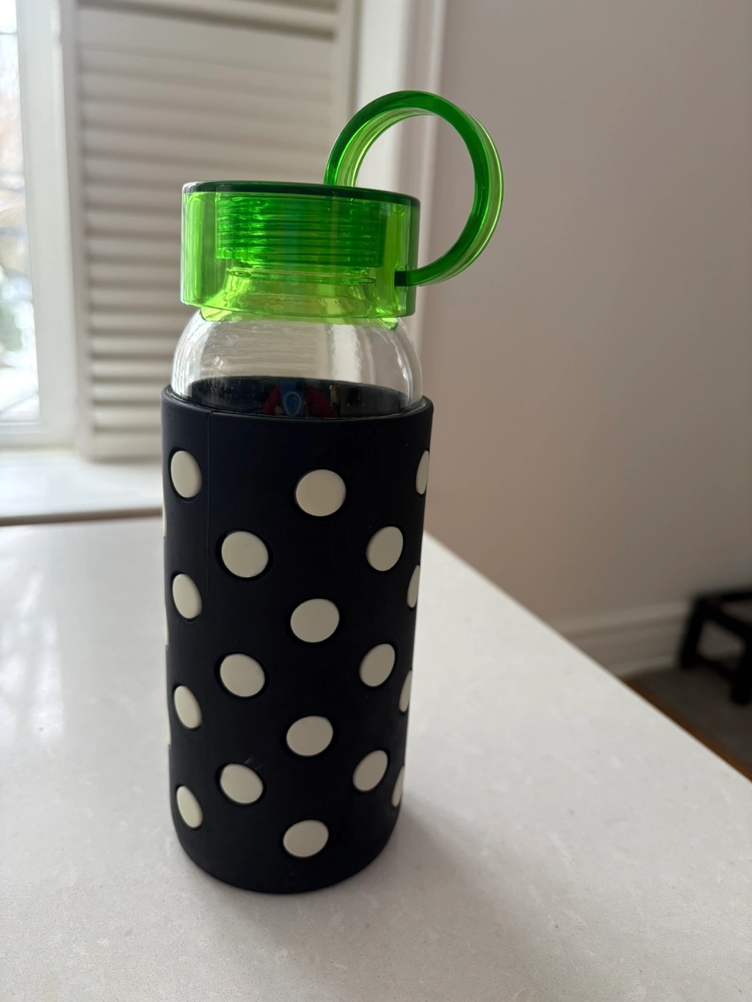 Cute glass water bottle. Features a black silicone sleeve with white polka dots. Green plastic lid with carrying loop. Perfect for everyday use.