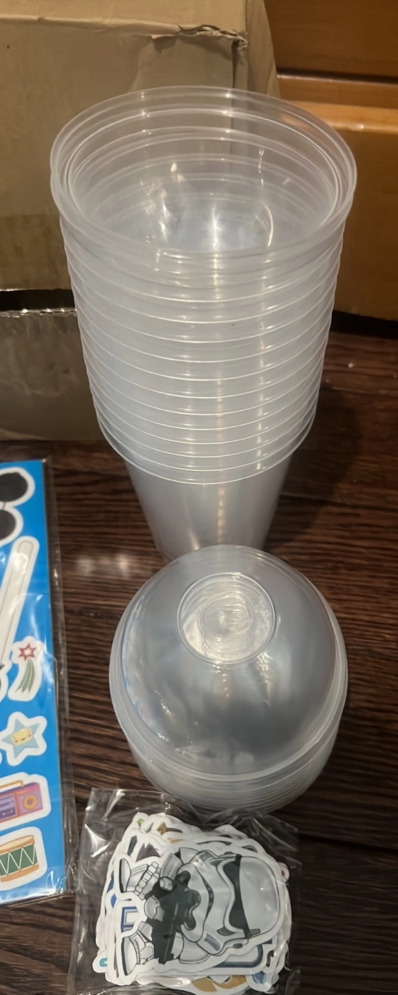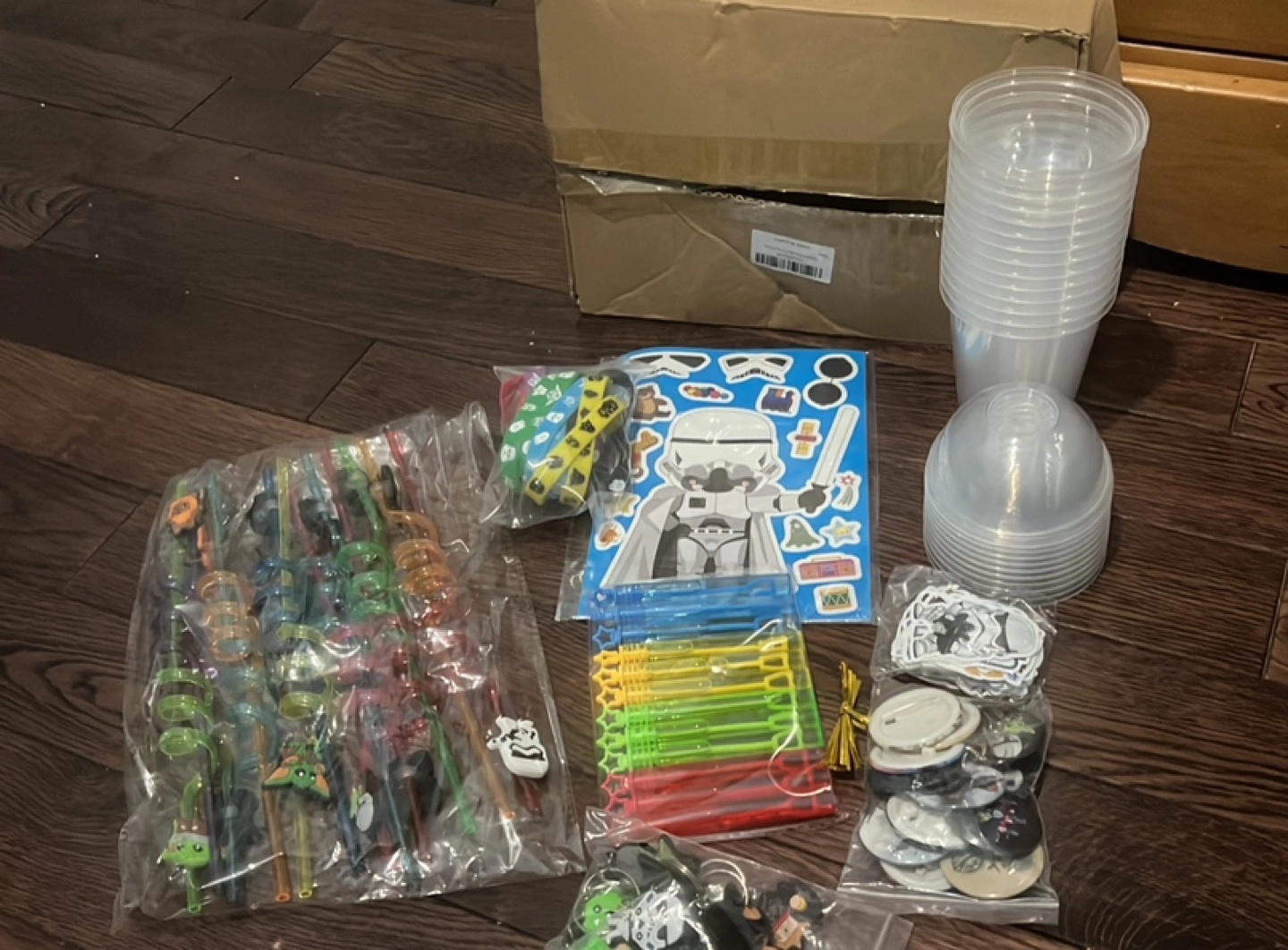 Bulk lot of party supplies. Includes various Star Wars themed items: stickers, straws, and keychains. Also contains clear plastic cups, bubble wands, and other assorted goodies. Perfect for a birthday party or event.